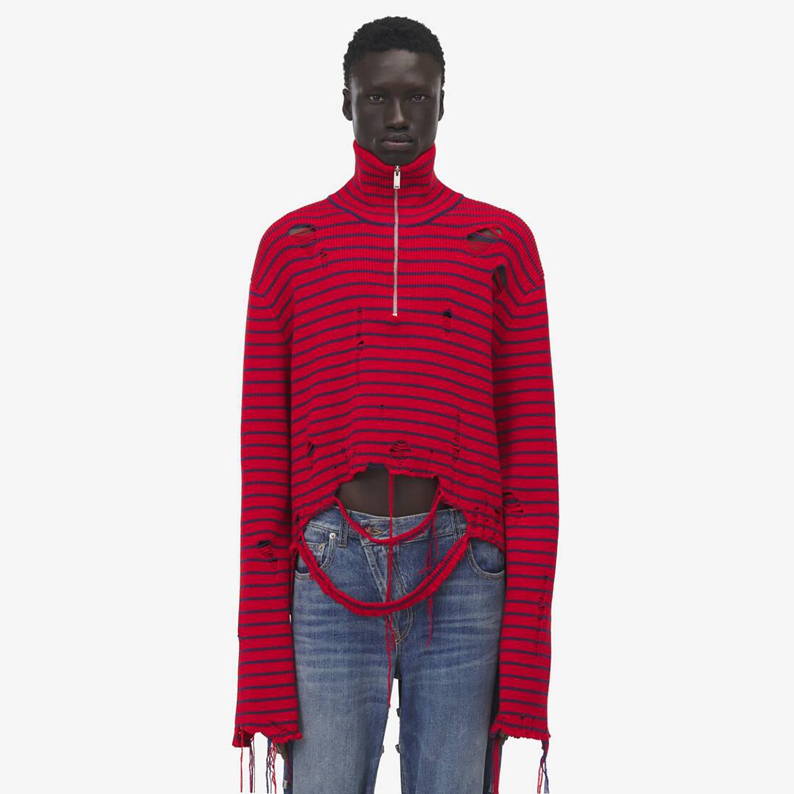 Alexander McQueen Men’s Distressed Striped Jumper in Fire Red