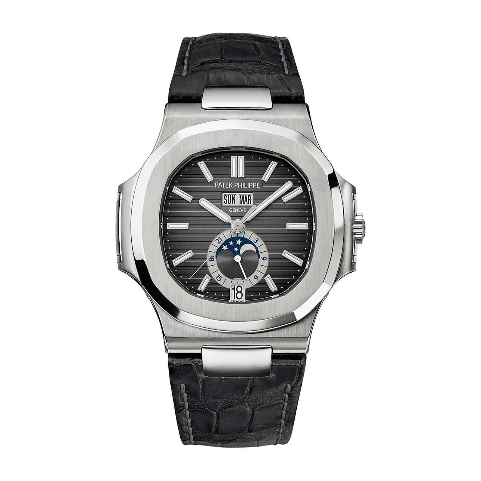 Patek Philippe 5724G-001 Nautilus 40mm Black-Blue Baguette Diamond Bezel Moon Phase Date White Gold Leather Automatic GRF