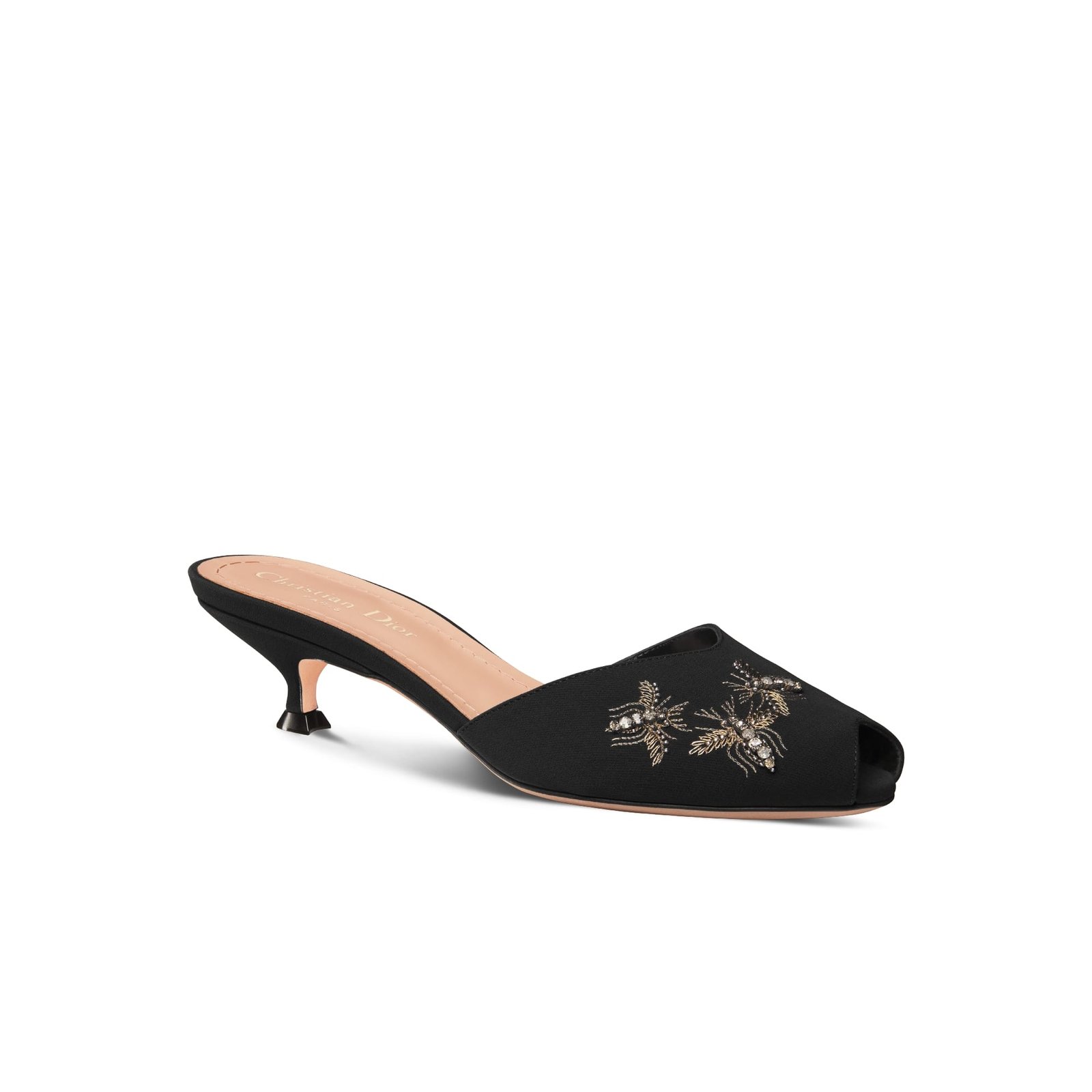 Dior D-Dream Heeled Slide Black Fabric Embroidered with Bee Motif in Silver-Tone Strass and Metallic Gold-Tone Thread
