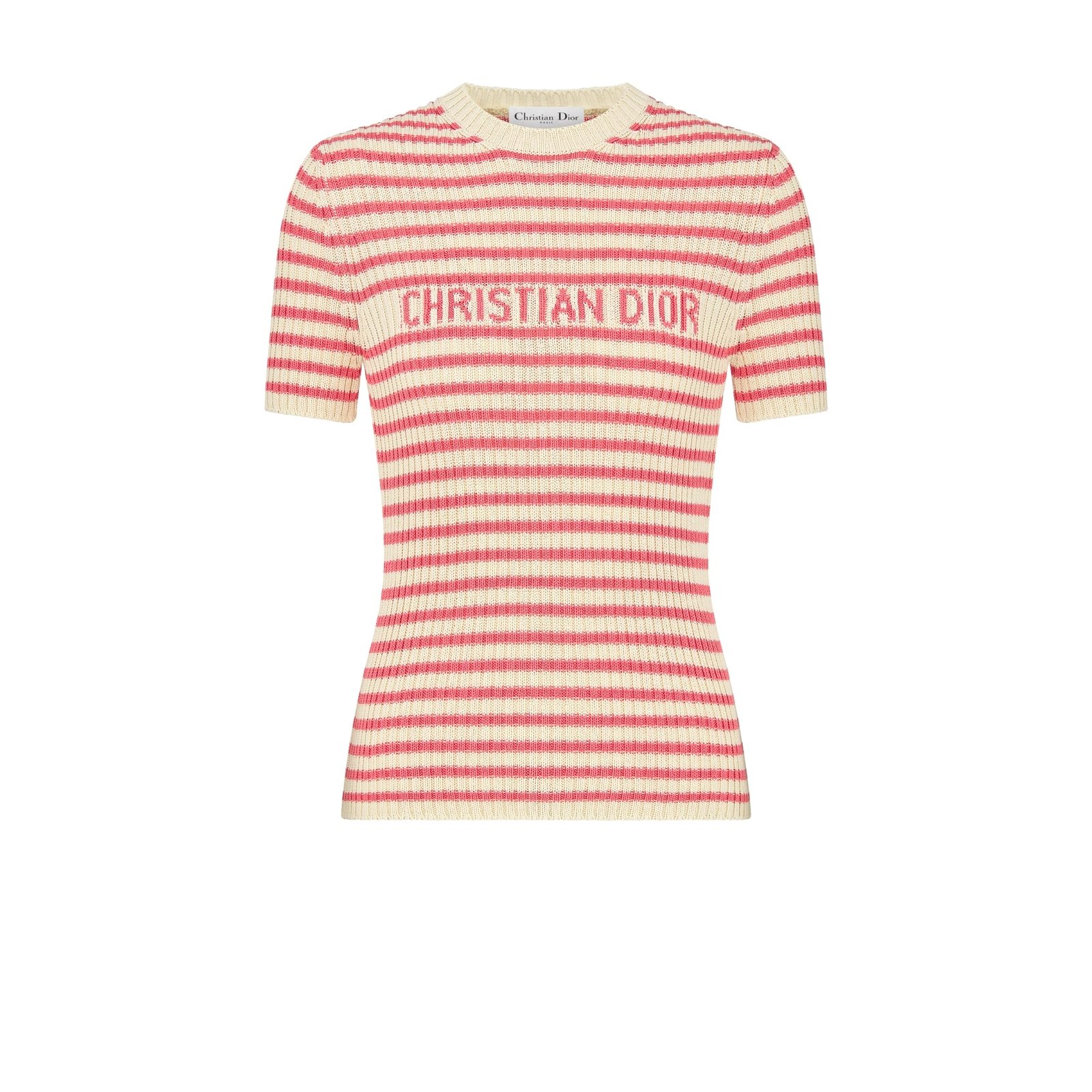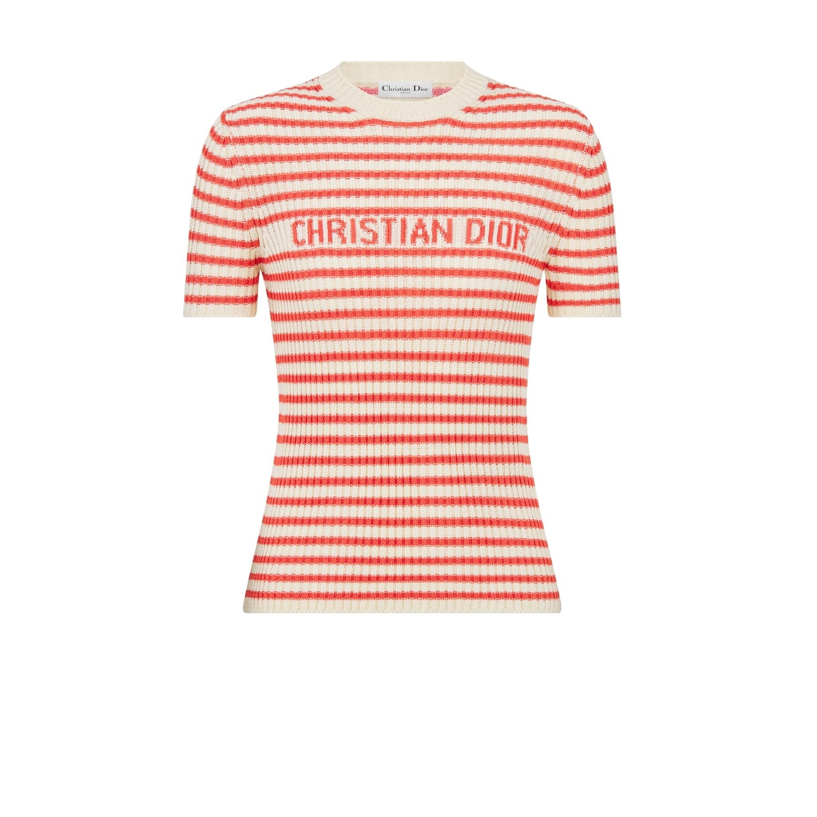 Dioriviera Short Sleeved Sweater White and Coral Cotton Ribbed Knit with Dior Mariniere Motif