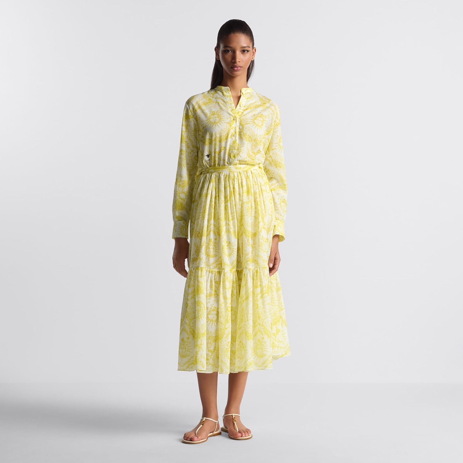 Dioriviera Long Blouse White and Lemon Yellow Cotton Muslin with Toile de Jouy Soleil Motif