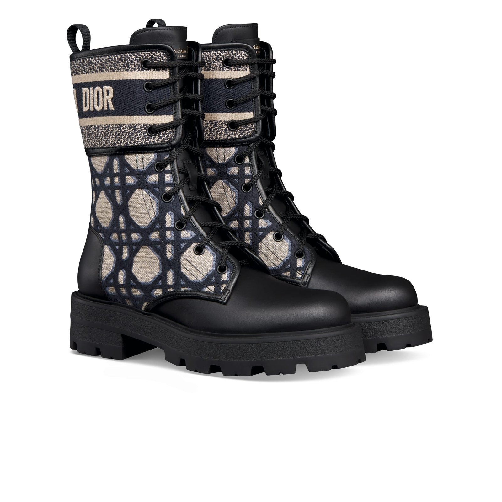 Dior D-Major Ankle Boot Black Calfskin with Deep Blue and Beige Embroidered Cannage Cotton