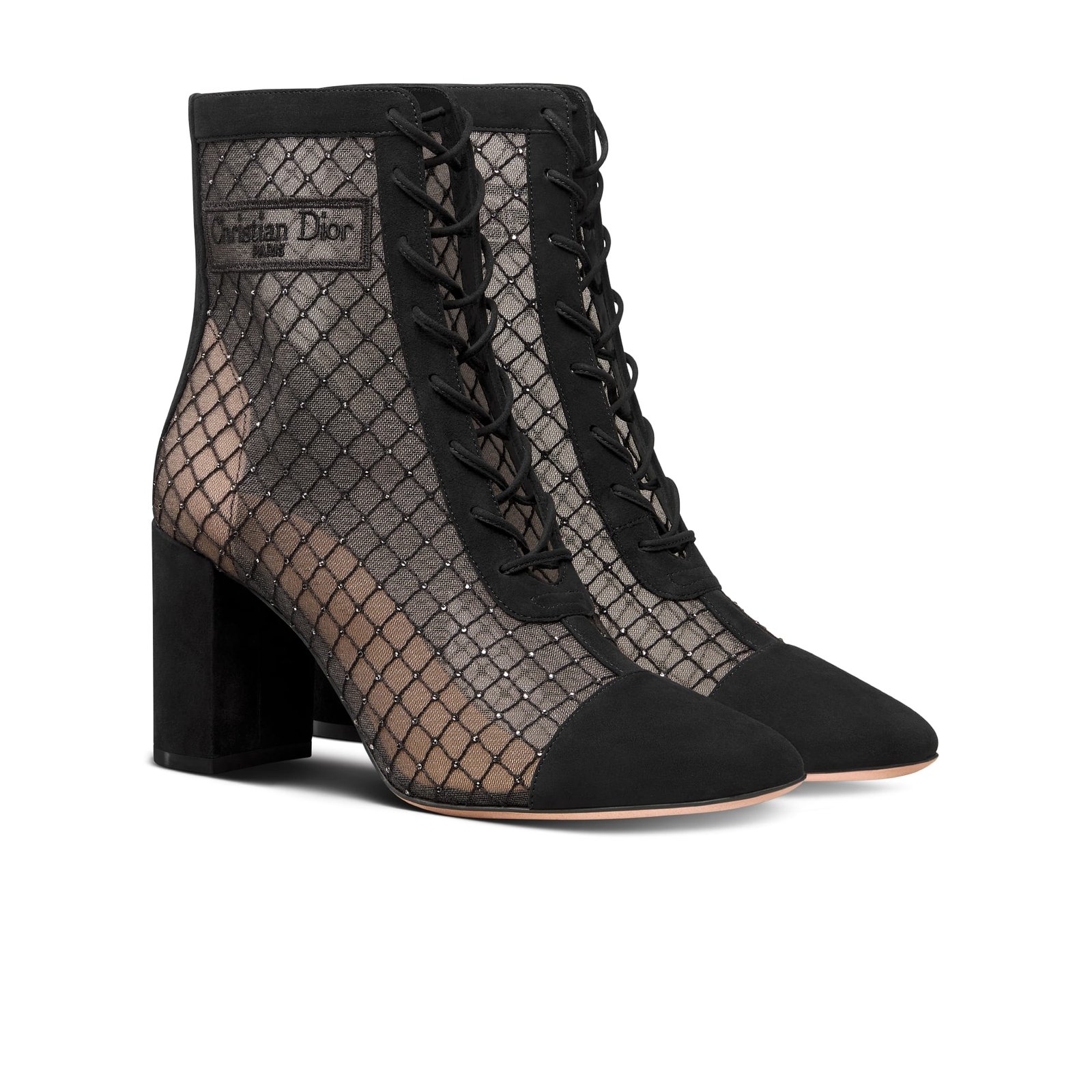 Dior Naughtily-D Heeled Ankle Boot Transparent Mesh Embroidered with Silver-Tone Strass and Black Suede Goatskin