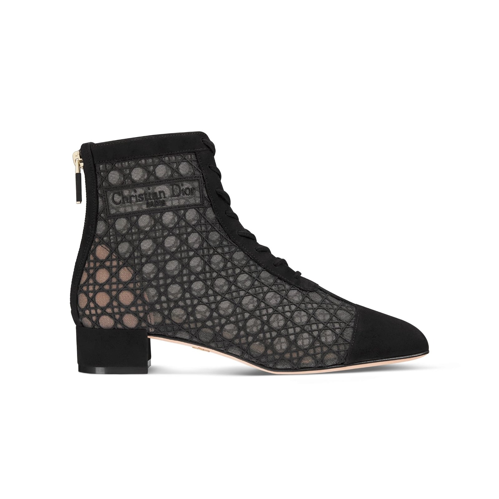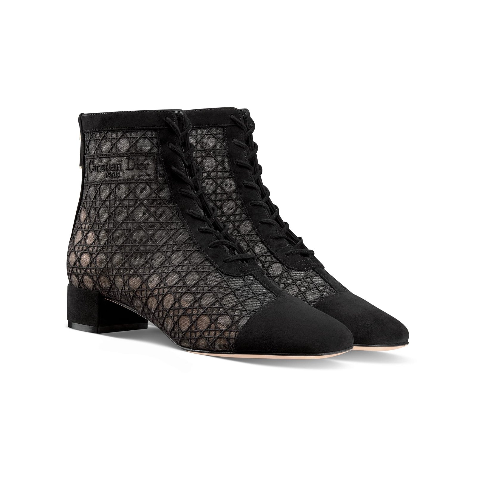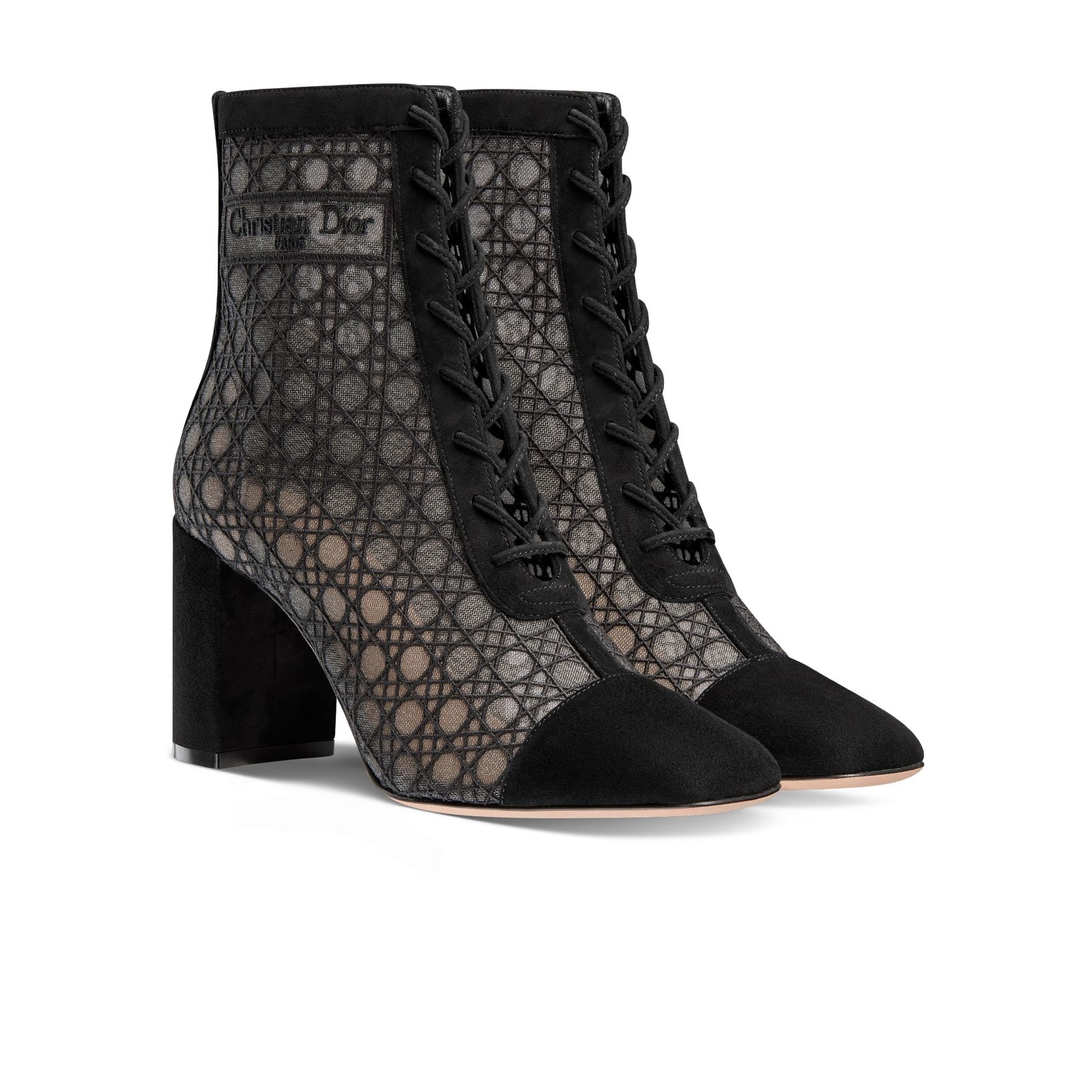 Dior Naughtily-D Heeled Ankle Boot Transparent Mesh Embroidered with Black Cannage Motif and Suede Goatskin