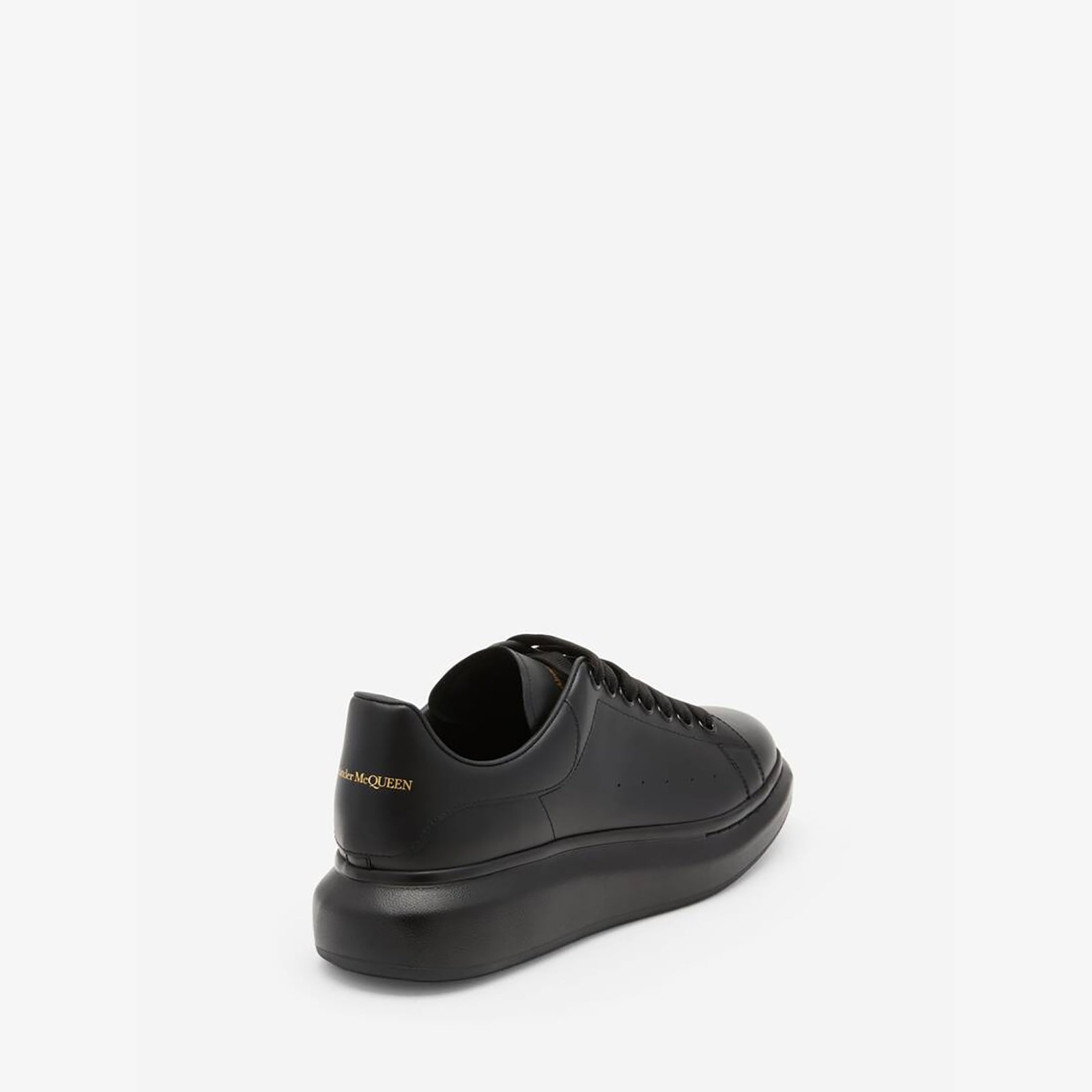 Black smooth calf leather sneaker with rounded toe and tonal black heel panel. Perforated air holes, large flat laces and Alexander McQueen signature on tongue and heel. Leather lined. Tonal black oversized rubber sole.