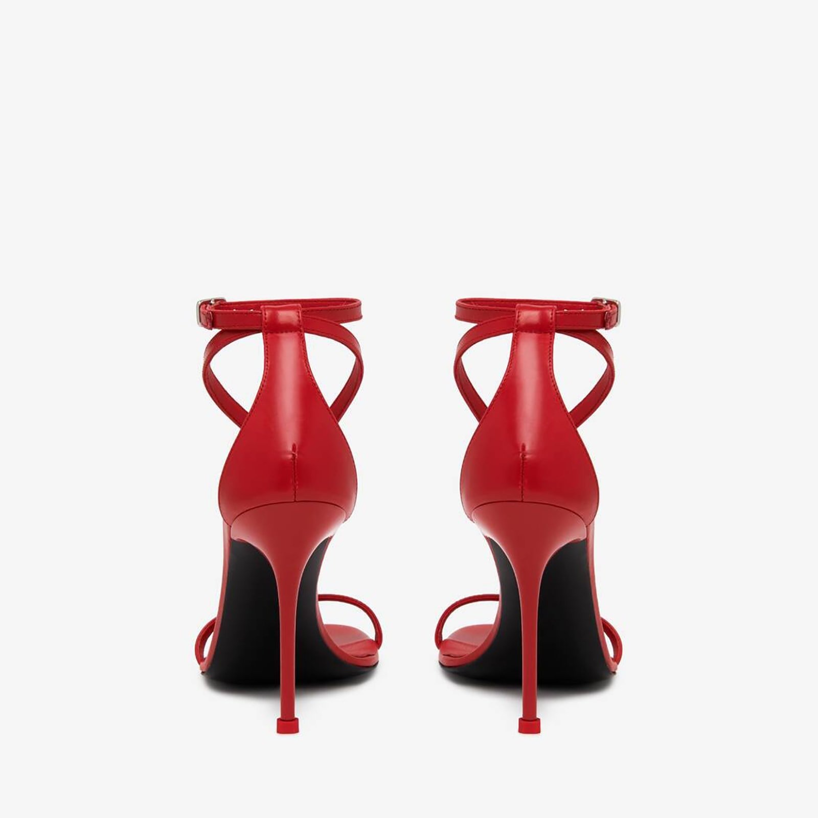 Lust red leather naked sandal featuring a round toe silhouette and a T-bar upper inspired by the iconic harnesses of the House. The sandal is finished with a tonal lacquered pin heel and signature lust red heel tip.