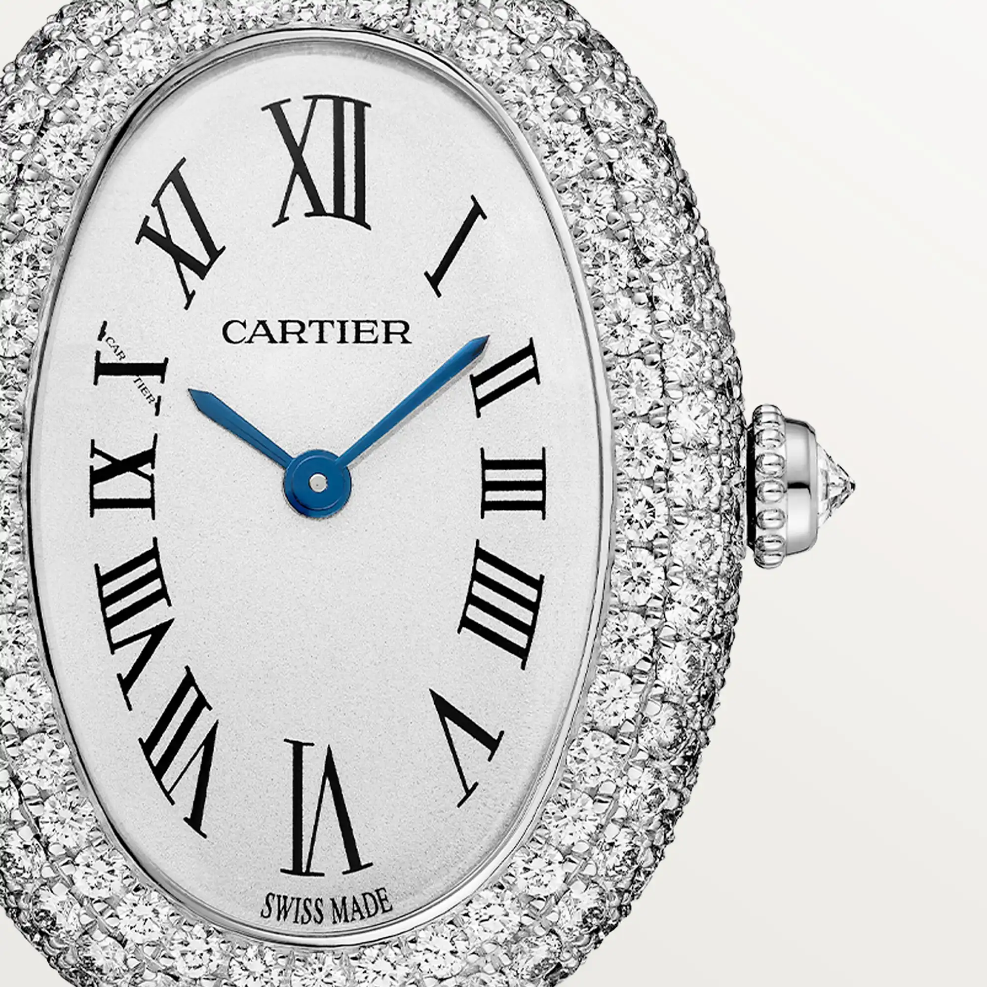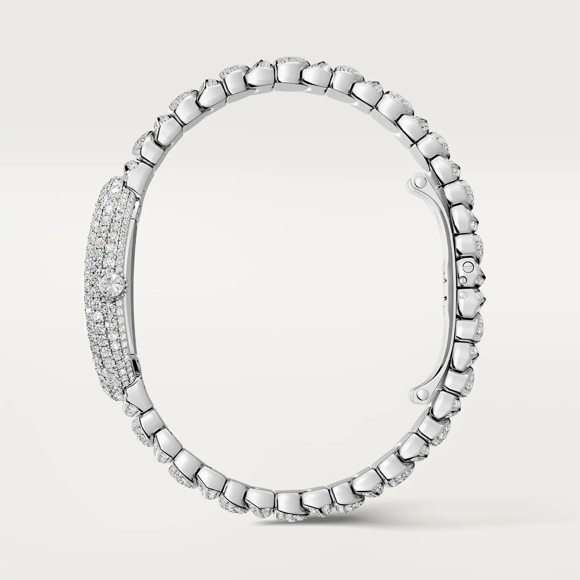 Baignoire de Cartier watch, small model, quartz movement. Case, crown and bracelet in rhodium-finish white gold 750/1000 set with 1026 brilliant-cut diamonds totaling 6.39 carats. Beaded crown, silvered dial, blued-steel sword-shaped hands, sapphire crystal. Length: 31.4 mm, width: 23.1 mm, thickness: 7.6 mm. Water-resistant up to 3 bar (approx. 30 meters/100 feet).