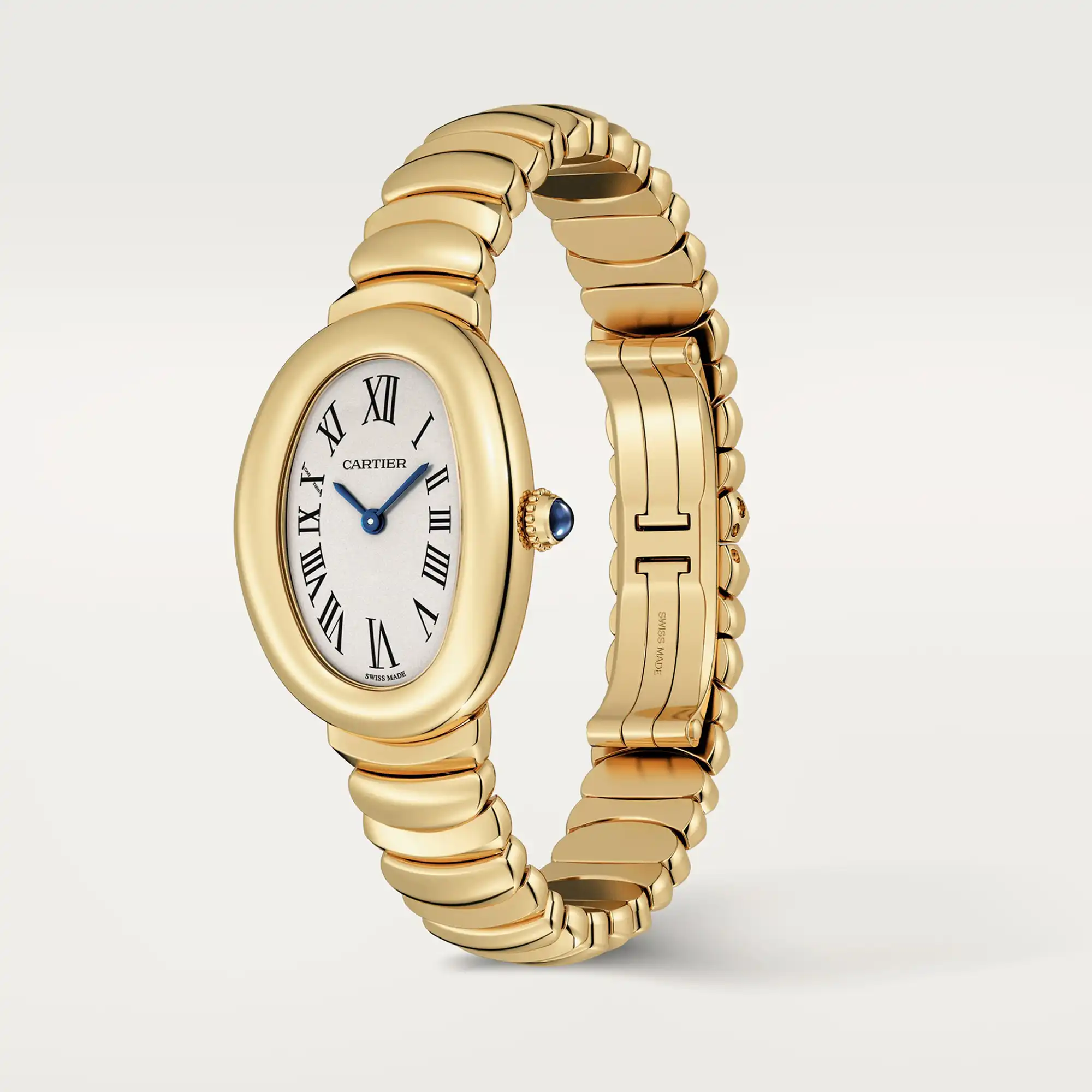 Baignoire de Cartier watch, small model, quartz movement. 18K yellow gold (750/1000) case and beaded crown. Silvered dial, blued-steel sword-shaped hands, sapphire crystal. 18K yellow gold (750/1000) bracelet. Length: 31.4 mm, width: 23.09 mm, thickness: 6.95 mm. Water-resistant up to 3 bar (approx. 30 meters).