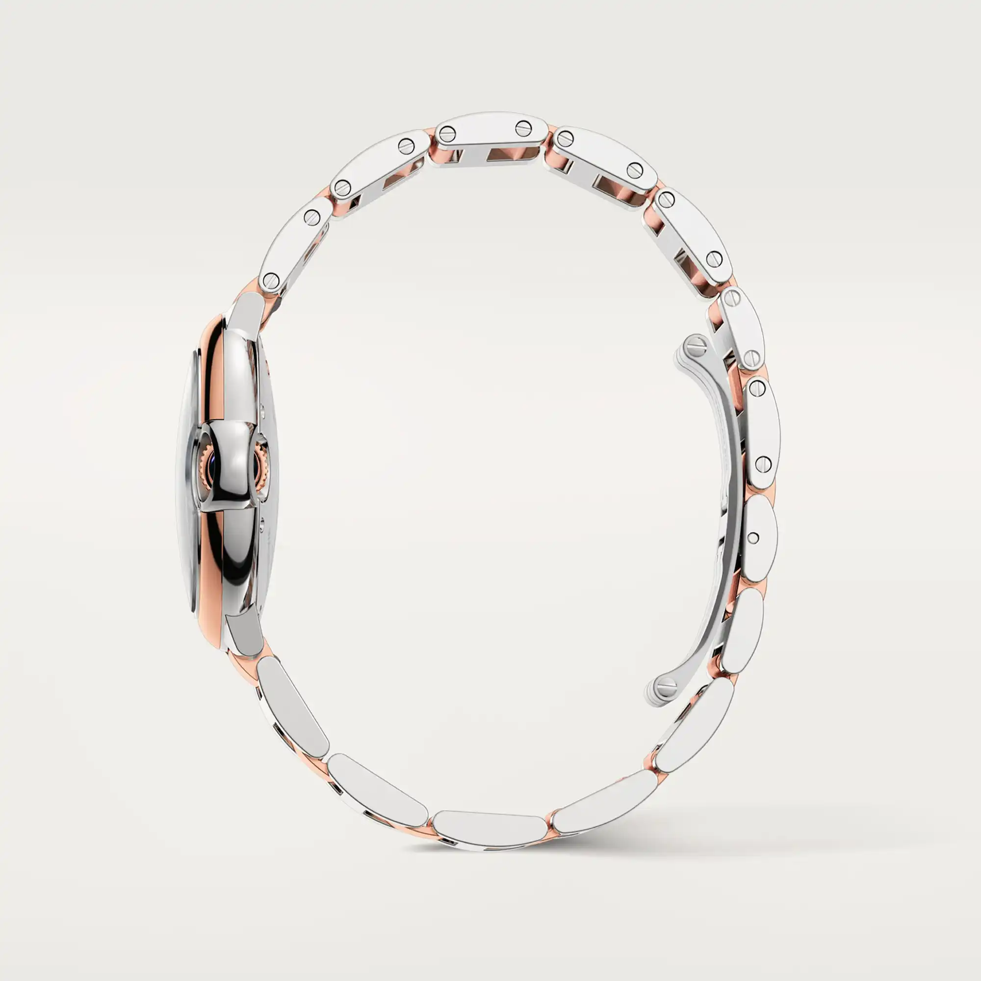 Ballon Bleu de Cartier watch, 33 mm, mechanical movement with automatic winding. Steel case, rose gold 750/1000 bezel, rose gold 750/1000 fluted crown set with a cabochon synthetic spinel. Silver guilloche dial. Blued-steel sword-shaped hands. Sapphire crystal. Two-tone interchangeable bracelet. Thickness: 10.16 mm. Water-resistant up to 3 bar (approx. 30 meters/100 feet).