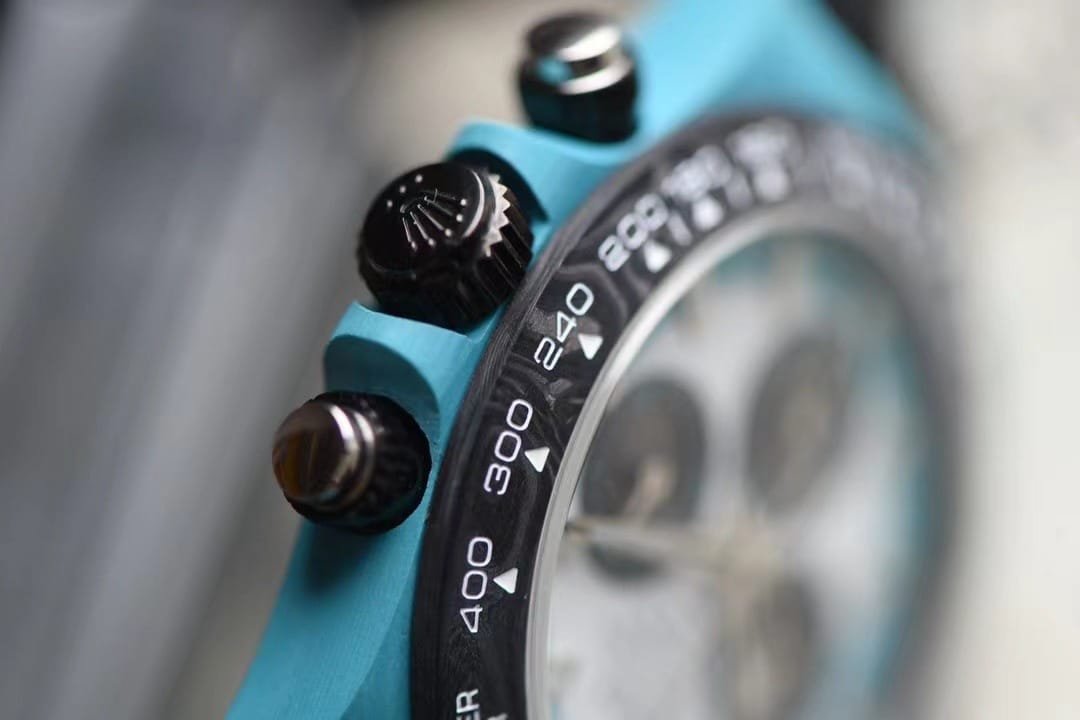 The Rolex Daytona Celeste Invert features a size of 40mm x 12.6mm and is equipped with an Asian clone 4130 automatic chronograph movement, designed to mimic the Rolex 4130 movement.