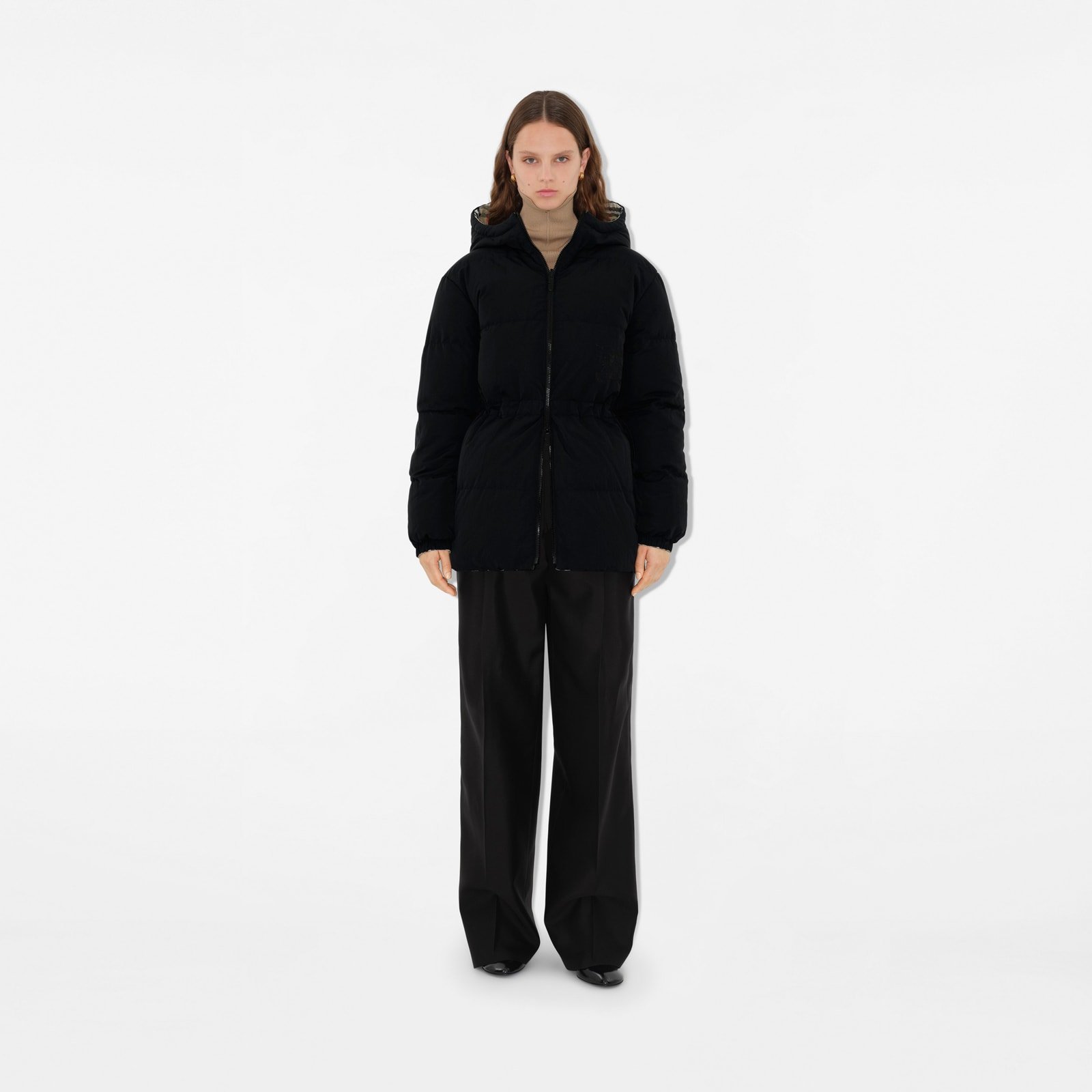 A hooded puffer jacket in nylon, filled with goose down and feathers. The reversible design switches from Burberry Check to a solid colour appliqued with the Equestrian Knight Design. Cut to a relaxed fit with a drawcord waist to adjust the silhouette. Part of Burberry Classics, wardrobe foundations with a unique Burberry slant.