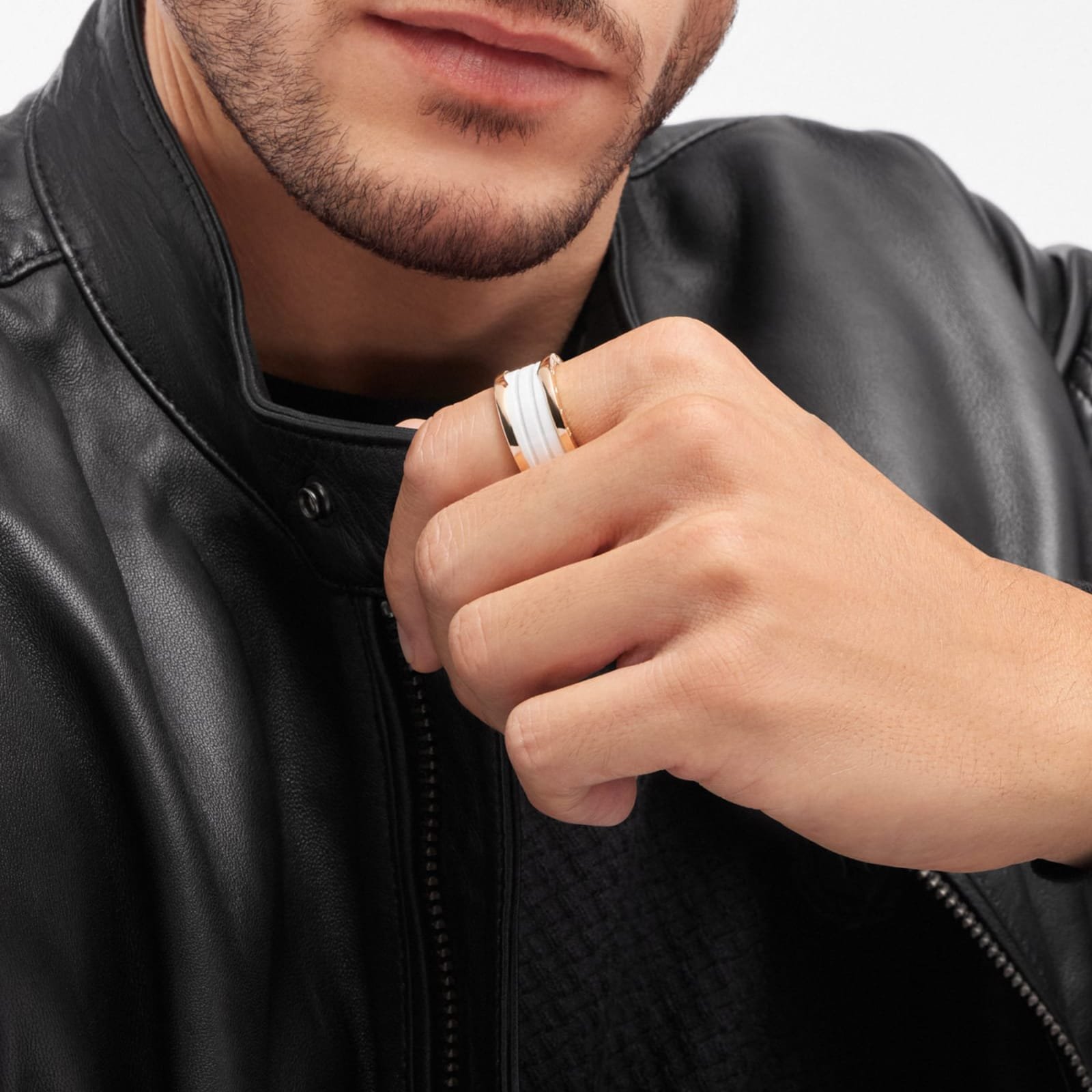 B.zero1 four-band ring with two 18 kt rose gold loops and a white ceramic spiral.
