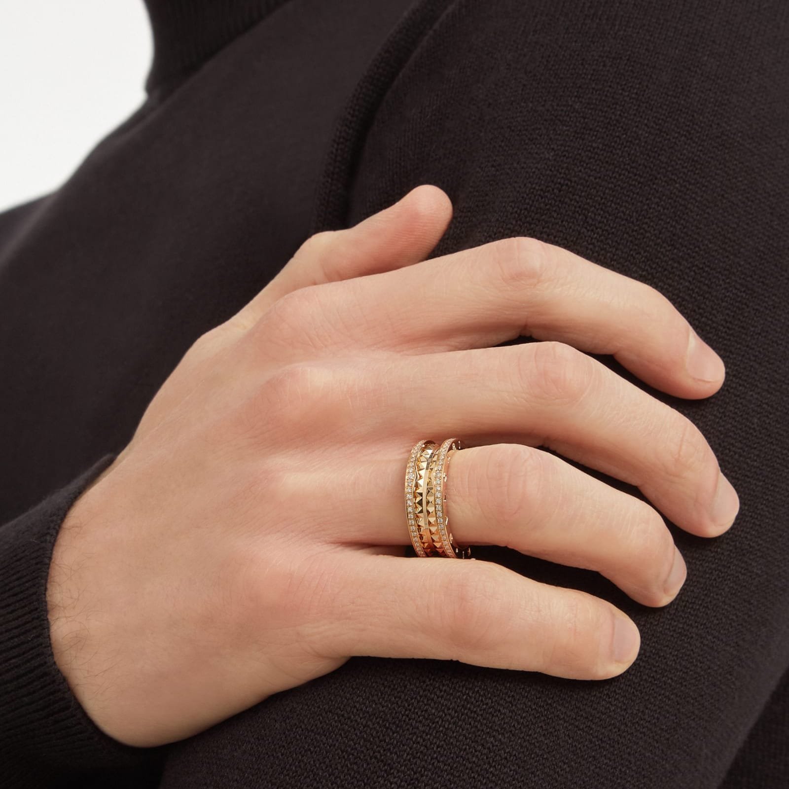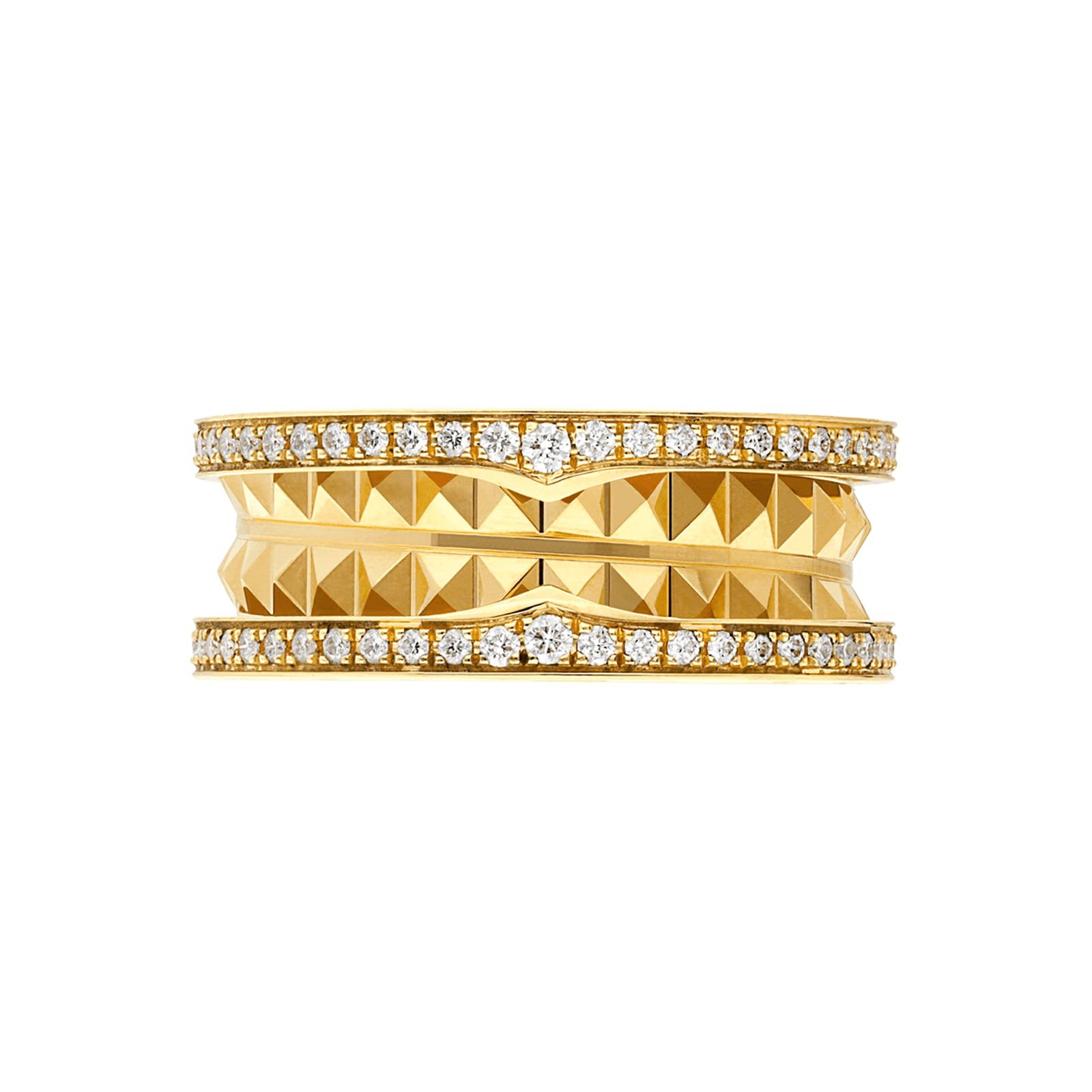 Drawing its inspiration from the most renowned amphitheatre of the world, the Colosseum, B.zero1 Rock is a ground-breaking statement of Bvlgari’s creative vision infused with a touch of irreverence. Challenging the very essence of jewellery aesthetics, its distinctive spiral is reimagined here with gold studs, highlighting the unapologetic and visionary spirit of Bvlgari’s icon of design. B.zero1 Rock two-band ring in 18 kt yellow gold with pave diamonds.
