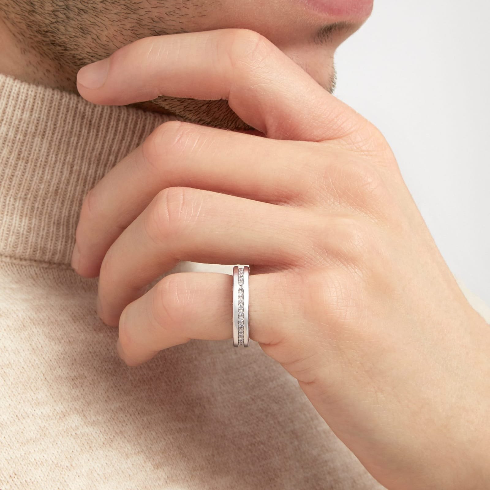 B.zero1 one-band ring in 18 kt white gold, set with pave diamonds on the spiral.