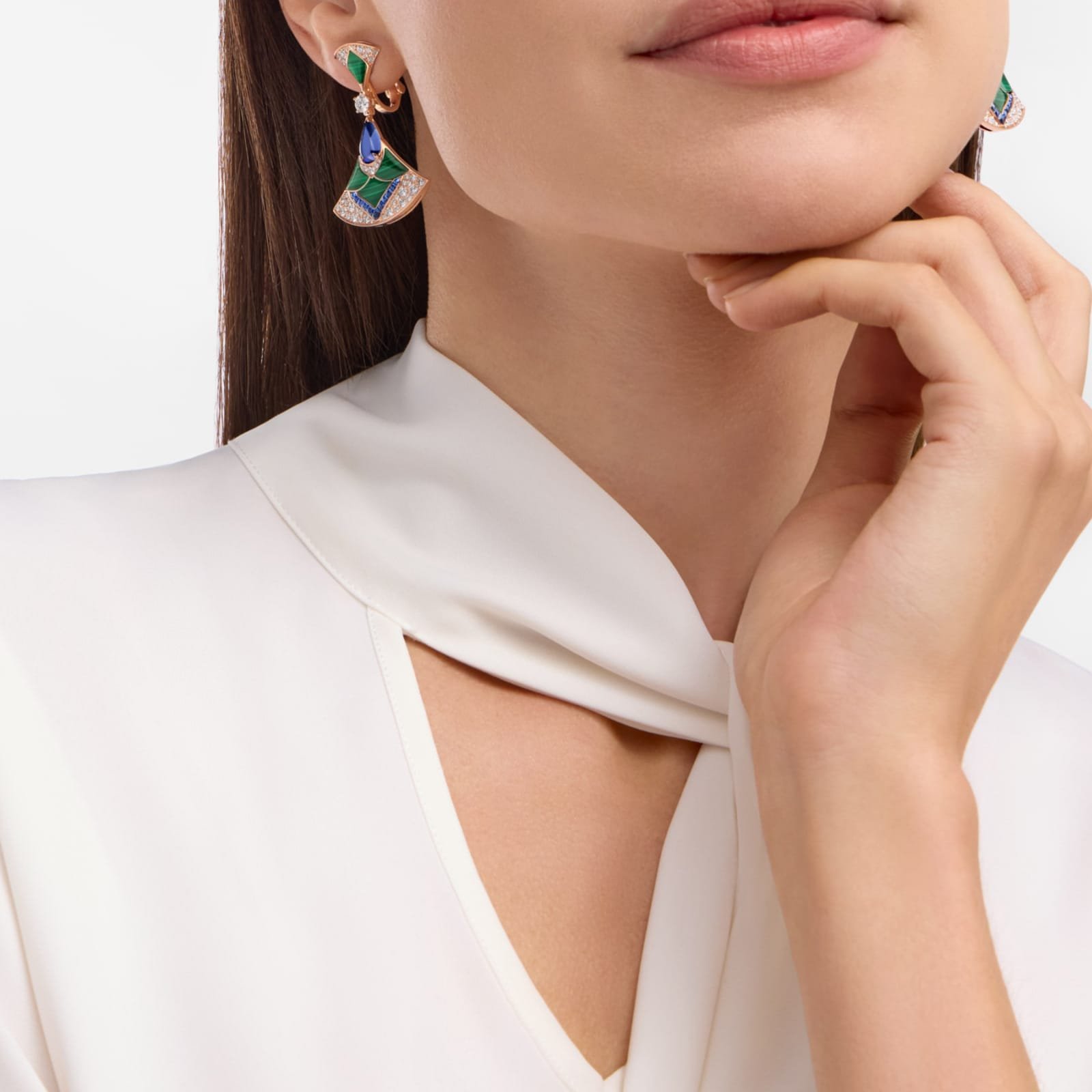 A refined expression of joyful femininity, the Divas’Dream 18 kt rose gold earrings offer a precious and colourful interpretation of the iconic fan-shaped motif. Deeply rooted in Bvlgari’s Roman heritage, the aesthetic signature of the collection is rendered through a delicate design, artfully set with vibrant tanzanites, blue sapphires, malachite elements, and sparkling diamonds. Graceful and timeless, the earrings are an ode to spontaneous beauty. Divas’Dream earrings in 18 kt rose gold with two round brilliant-cut diamond, two pear-shaped tanzanites, fancy-cut blue sapphires, malachite inserts and pave diamonds