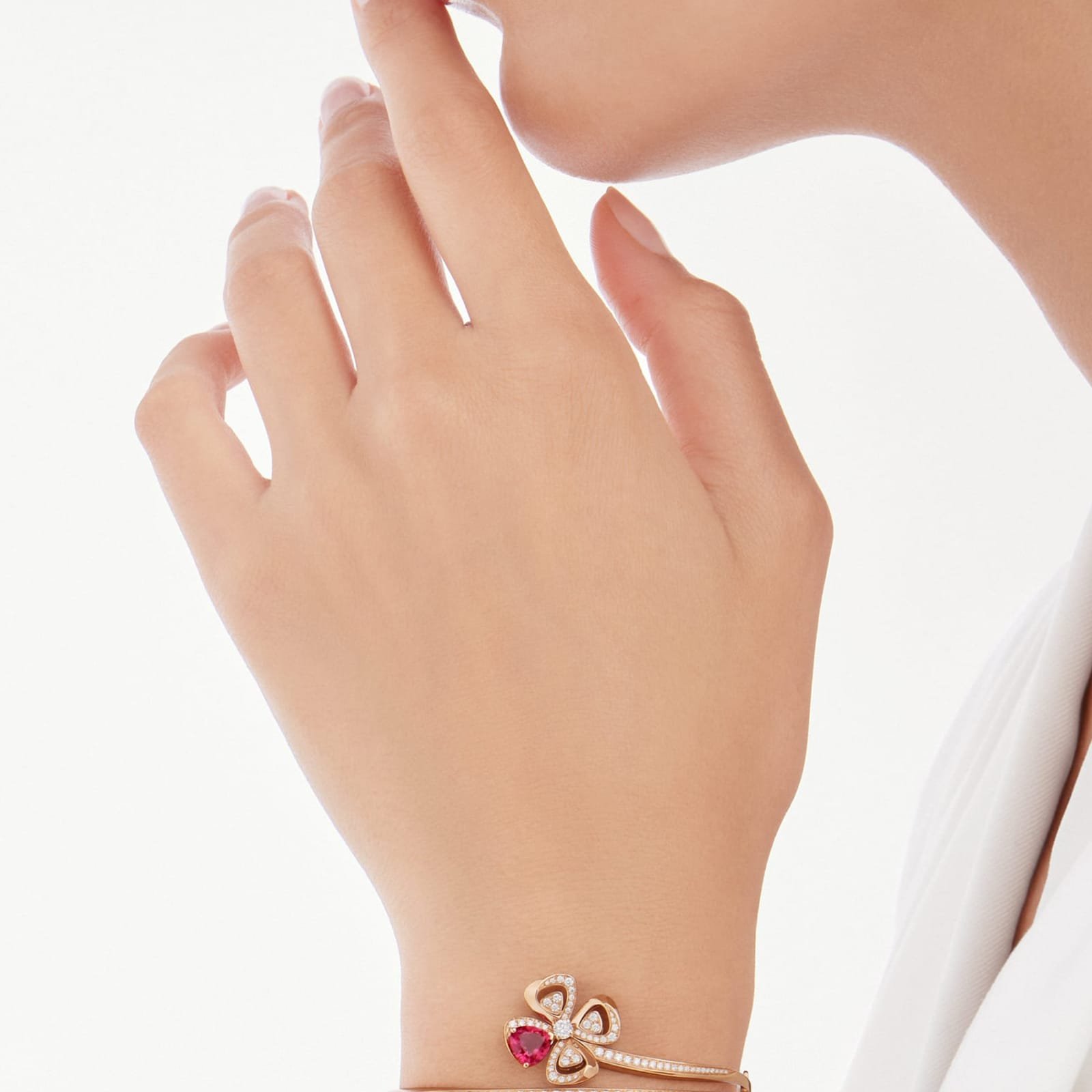 Blooming with its gem-set corolla, the Fiorever 18 kt rose gold bracelet draws inspiration from the alluring four-petal flower cherished by the Romans as a symbol of happiness and joy. Embellished with the timeless elegance of precious diamonds, the floral motif is animated by Bvlgari’s signature touch of colour, with two rubellite petals creating a beautiful interplay of volumes, shapes and reflections. Fiorever bracelet in 18 kt rose gold with a brilliant-cut diamond, a fancy-cut and a pear-shaped rubellite, and pave diamonds.