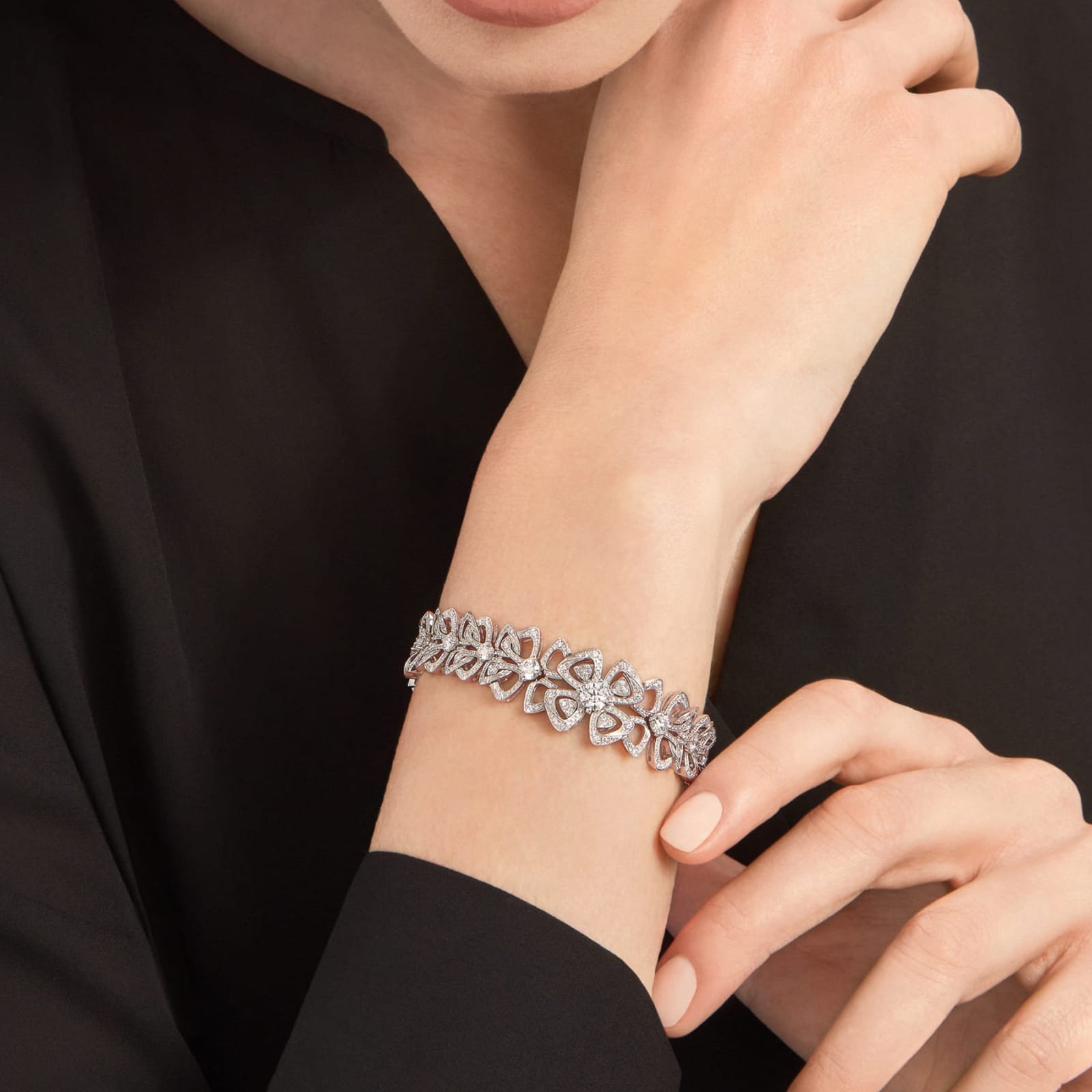 Blooming amongst the marvels of the Eternal City, Fiorever draws inspiration from the alluring four-petal flower cherished by the Romans as a symbol of happiness and joy. In a blend of two meaningful words, Fiore, Italian for flower, and forever, Fiorever celebrates the Roman love for life with a free-spirited and passionate design. Meant to sparkle with an eternal glow, the precious floral icon is crafted with a corolla of the highest quality diamonds. Fiorever bracelet in 18 kt white gold with 20 round brilliant-cut diamonds and pave diamonds.