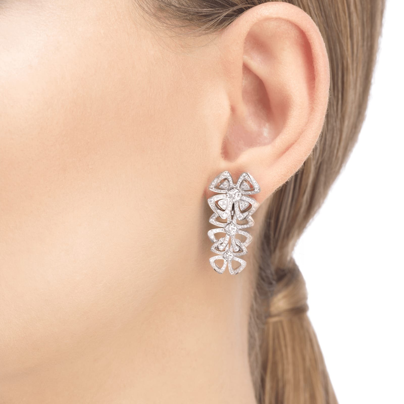 Blooming amongst the marvels of the Eternal City, Fiorever draws inspiration from the alluring four-petal flower cherished by the Romans as a symbol of happiness and joy. In a blend of two meaningful words, Fiore, Italian for flower, and forever, Fiorever celebrates the Roman love for life with a free-spirited and passionate design. Meant to sparkle with an eternal glow, the precious floral icon is crafted with a corolla of the highest quality diamonds. Fiorever pendant earring in 18 kt white gold with 6 round brilliant-cut diamonds and pave diamonds.