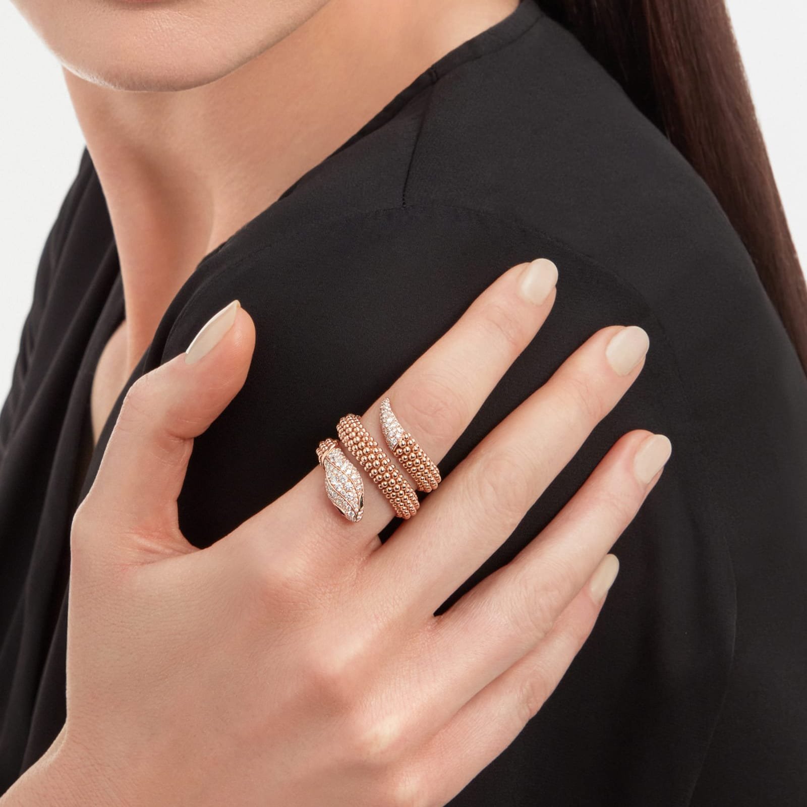 Inspired by the transformative nature of the mythical snake, that sheds its skin to embrace change and renew its power, Bvlgari’s Serpenti icon has been a symbol of endless metamorphosis since 1948. Exuding irresistible magnetism and timeless charisma, the Serpenti 18 kt rose gold ring is artfully made of small, mobile, gold beads, adding movement and tactile appeal to the jewellery piece, while its mesmerising head and tail are set with pave diamonds, in a blend of superior craftsmanship and magnificent wearability. A source of strength and self-confidence, always in tune with the times.