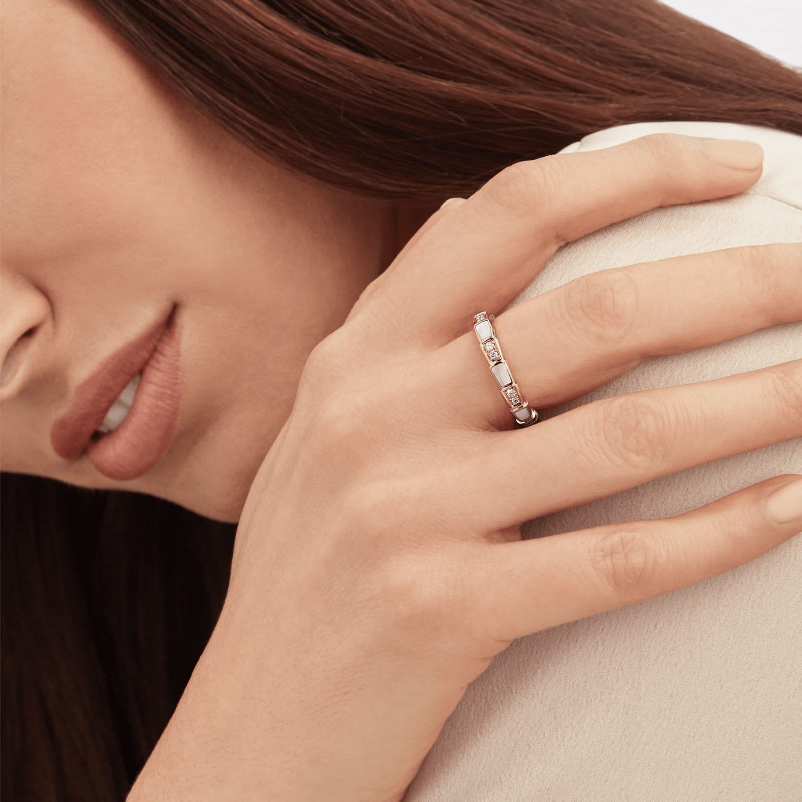 With its signature blend of pure aesthetics, enveloping shapes and charismatic flair, the Serpenti Viper 18 kt rose gold band ring with pave diamonds and white mother-of-pearl inserts is an essential interpretation of Bvlgari’s icon of endless metamorphosis. Capturing the powerful and ever-evolving nature of the mythical serpent, the magnetic jewellery creation inspires us to embrace change as a source of strength and self-confidence. Easy to mix and match, the ring offers endless styling options, embodying the collection’s versatile spirit.