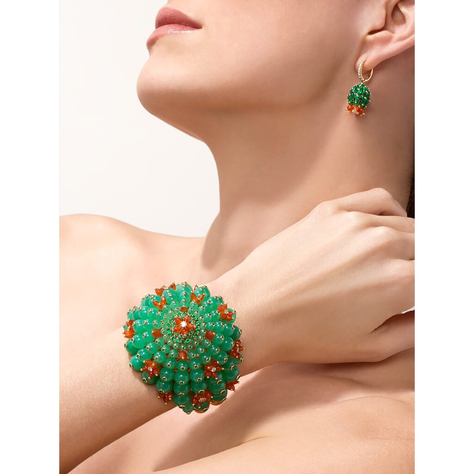 Cactus de Cartier earrings, yellow gold 750/1000, emeralds, carnelians, each set with 11 brilliant-cut diamonds totaling 0.38 carats.