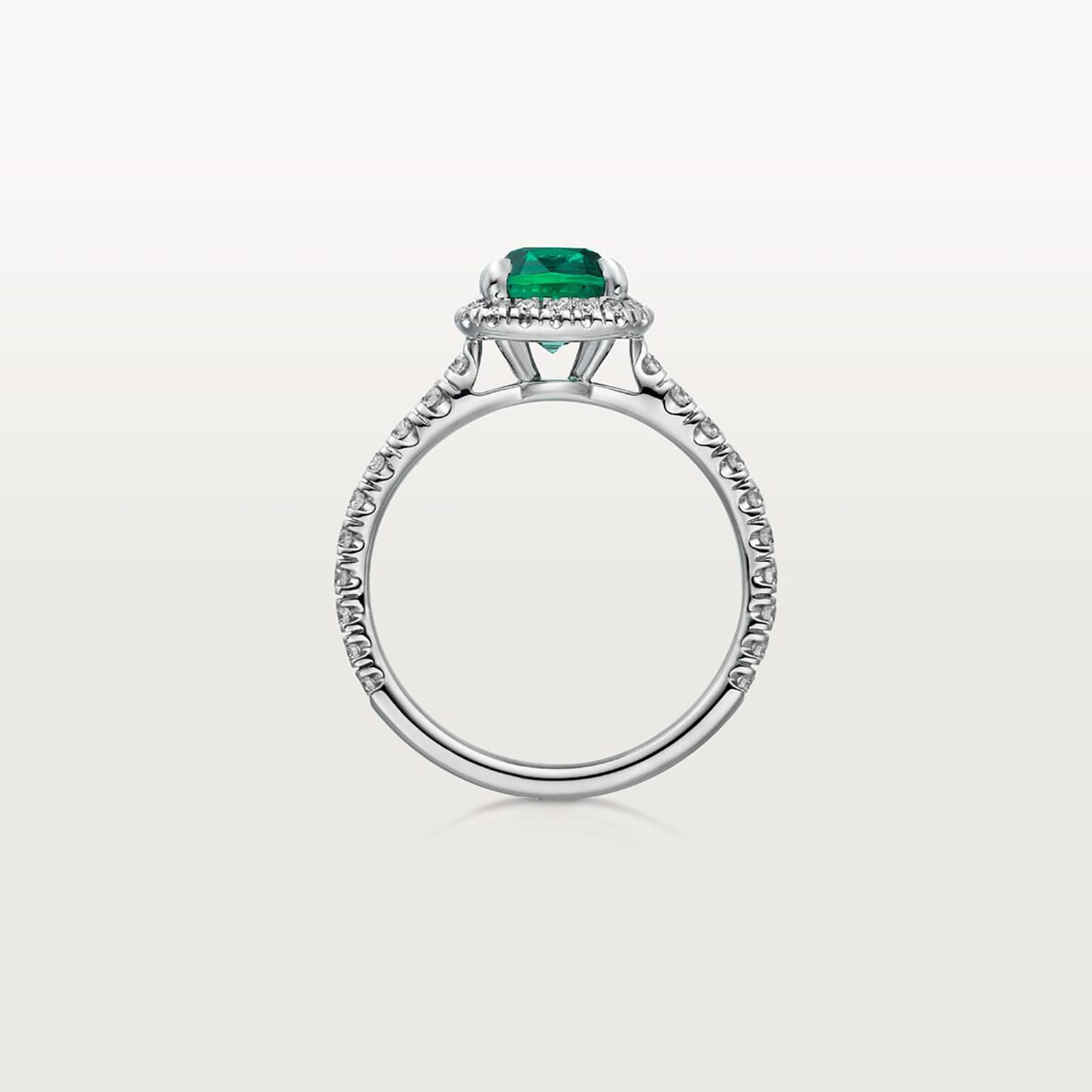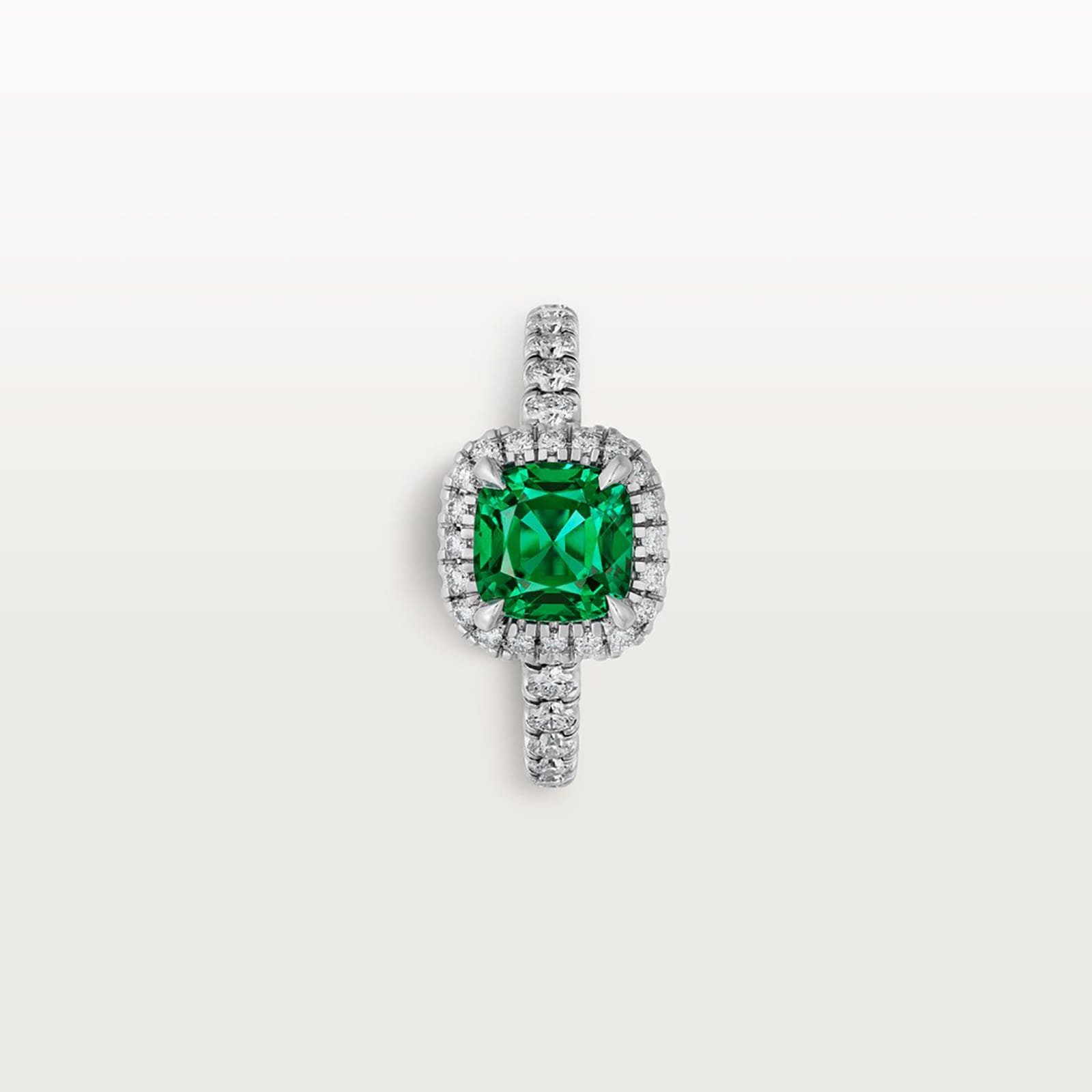 Cartier Destinee solitaire, platinum 950/1000, set with a cushion-cut emerald available from 1.00 carat, and paved with brilliant-cut diamonds.