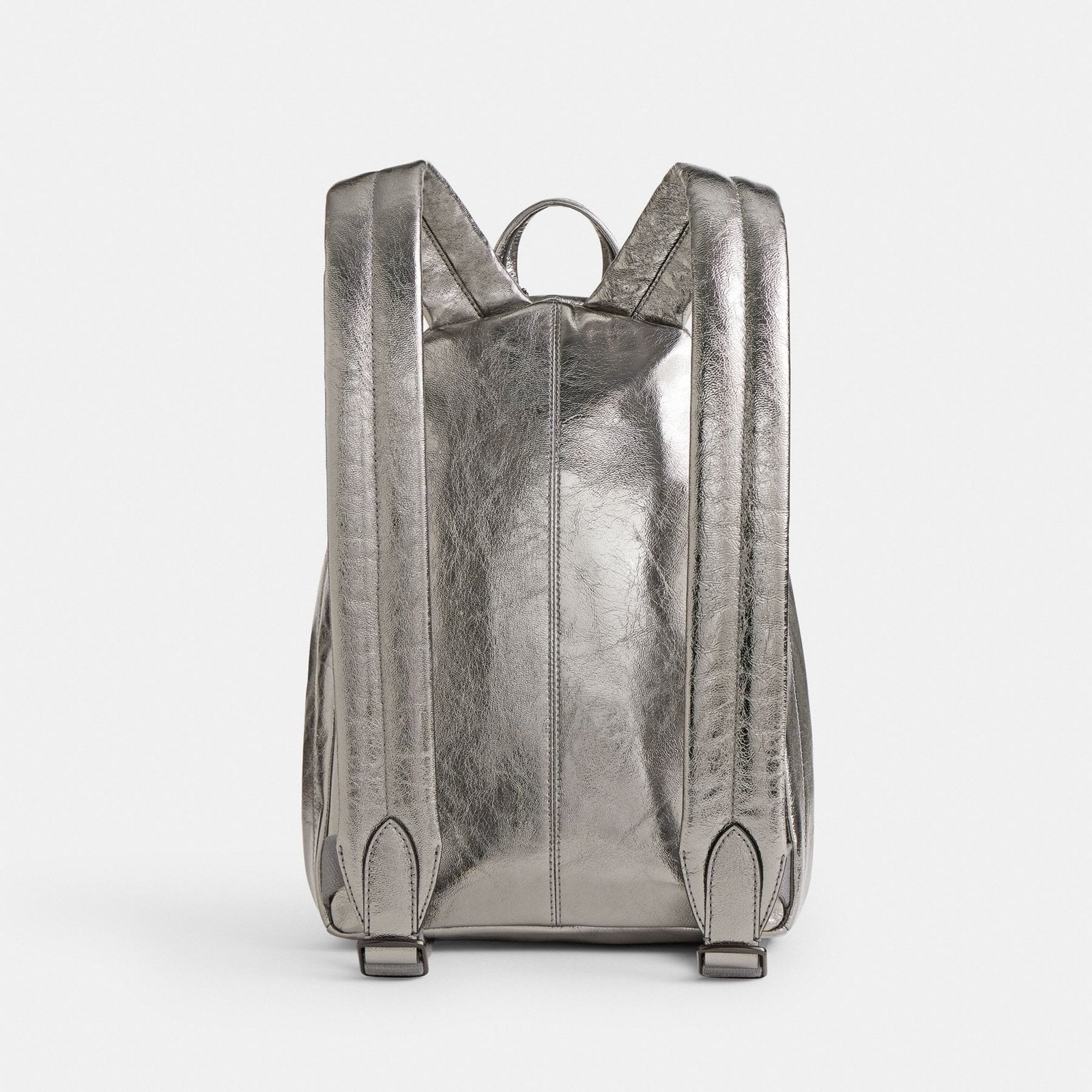 Metallic leather Inside zip, cell phone and multifunction pockets Zip closure, fabric lining Handle with 5cm drop Outside zip pocket Adjustable shoulder straps 22cm (L) x 31.5cm (H) x 8cm (W)