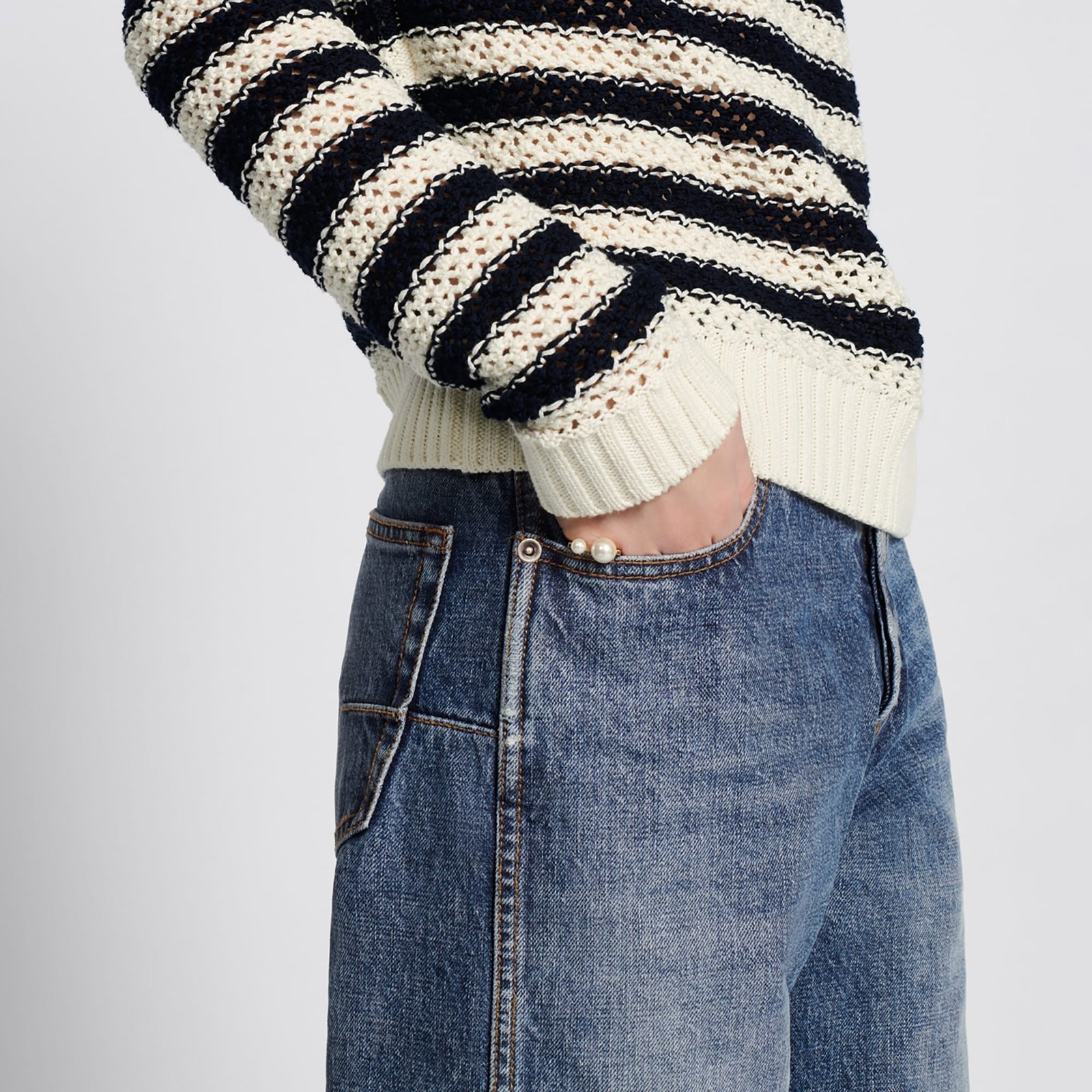 The denim pants are from the Dior 8 capsule collection and are distinguished by a cropped straight cut with side pockets and patch pockets. Crafted in blue stonewashed cotton denim, they feature a Christian Dior jacron label on the back that is enhanced by two horizontal bands and the style number, D03. The jeans will complete any casual look.