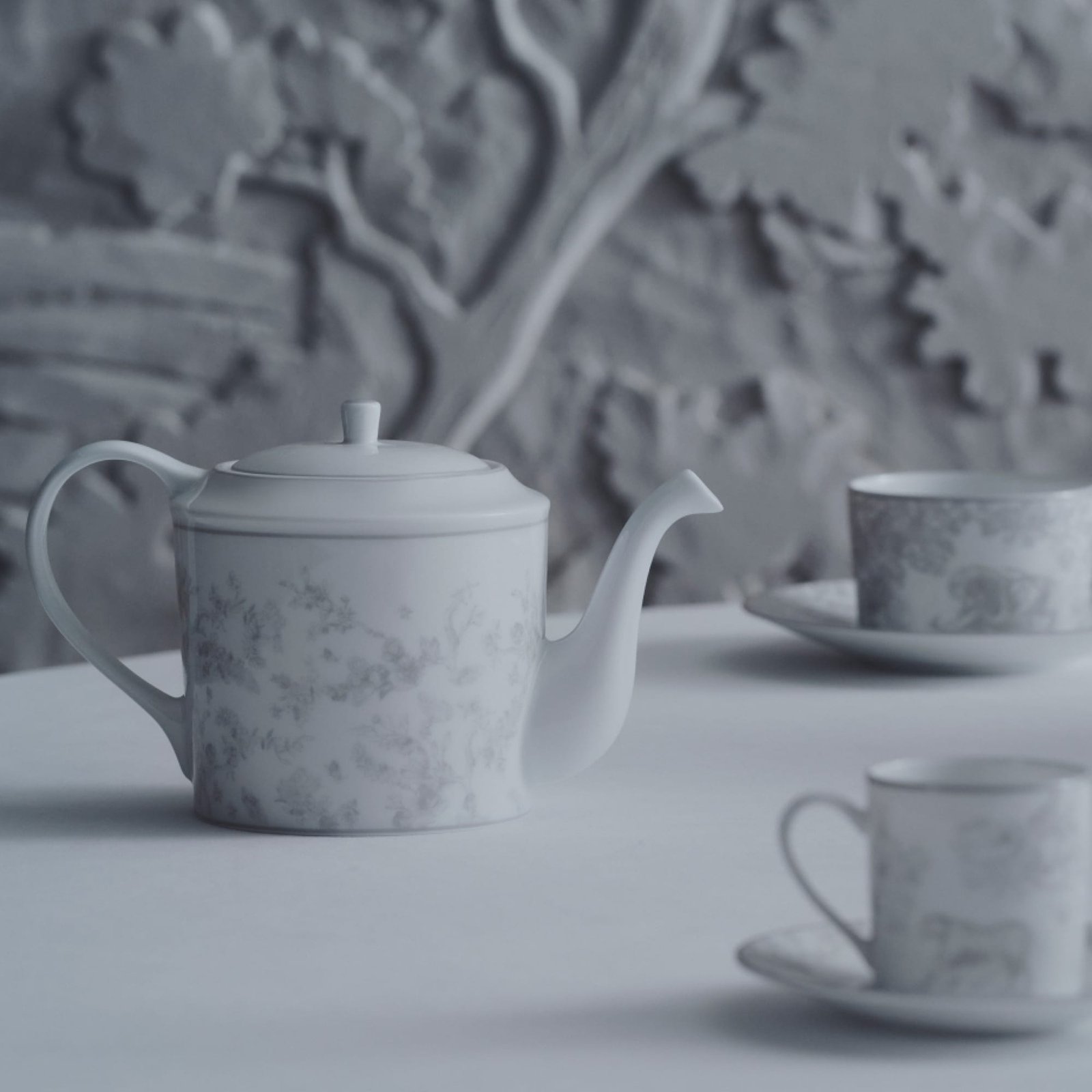 A symbol of French savoir-faire and the Dior spirit, Toile de Jouy is constantly reimagined by Maria Grazia Chiuri and adorns new creations in Limoges porcelain.Shaped pieces, including a coffee pot and a trinket tray, showcase the mythological scene in shades of blue and gray.A celebration of the art of hosting dear to Mr.Dior.
