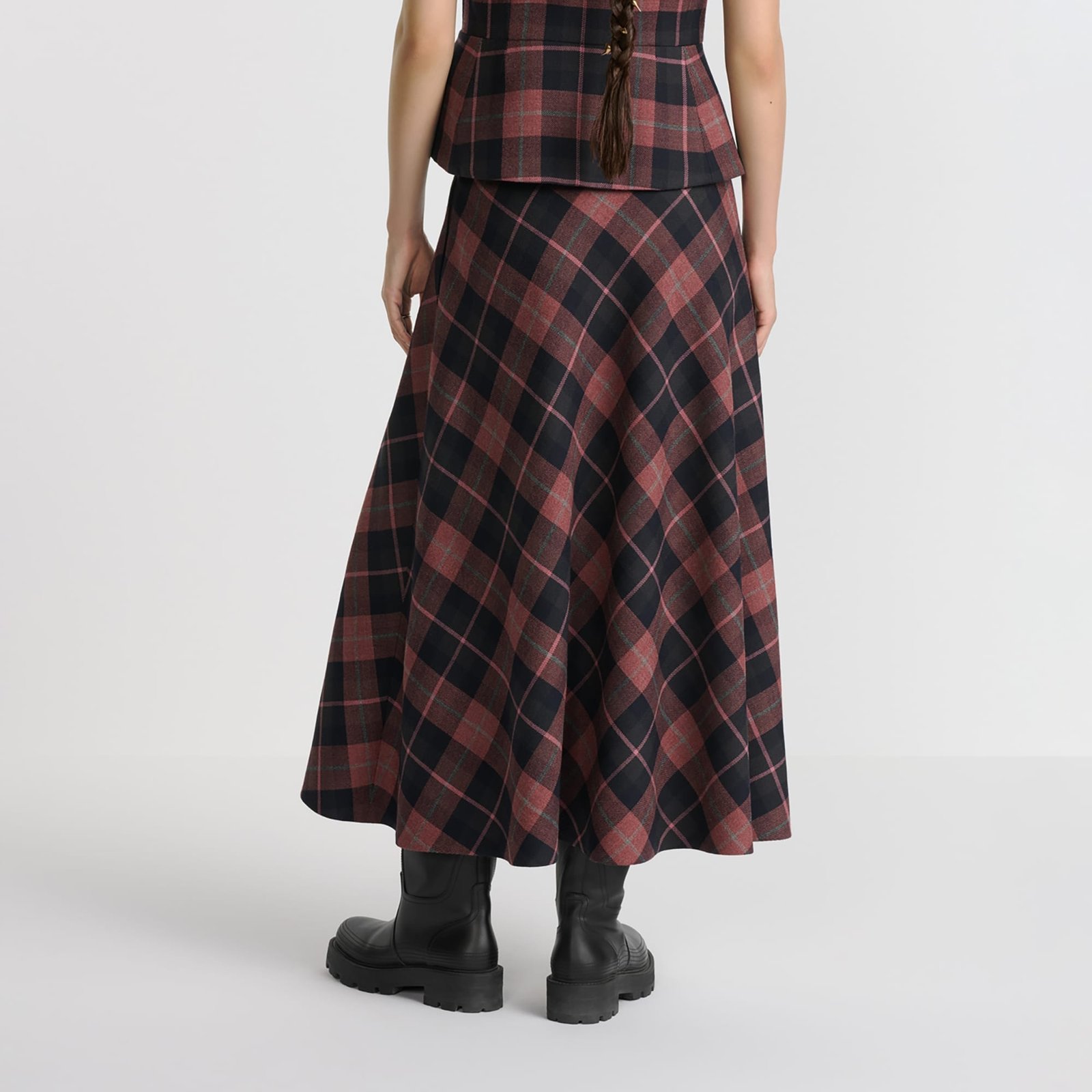The mid-length skirt showcases the pink, gray and white Check’n’Dior motif, a hallmark Maria Grazia Chiuri pattern and inspired by the collection’s signature theme of Scottish heritage. Crafted in virgin wool, it features an elegant flared cut. The mid-length skirt can be paired with other Check’n’Dior creations to complete the look.