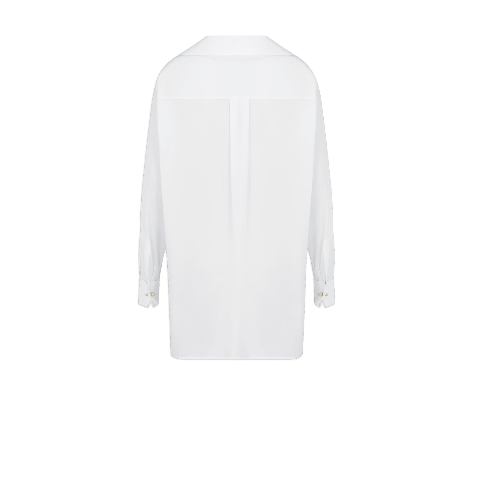 A Dior silhouette staple, the blouse offers a new twist on elegance and modernity. Crafted in white cotton poplin, it features a long silhouette accented by a slit neckline and cuffs with Dior Tribales buttons that showcase a resin pearl adorned with a star, inspired by the iconic House earring. Complete with a black embroidered star and CD signature, the blouse may be paired with a skirt from the collection for a contemporary look.