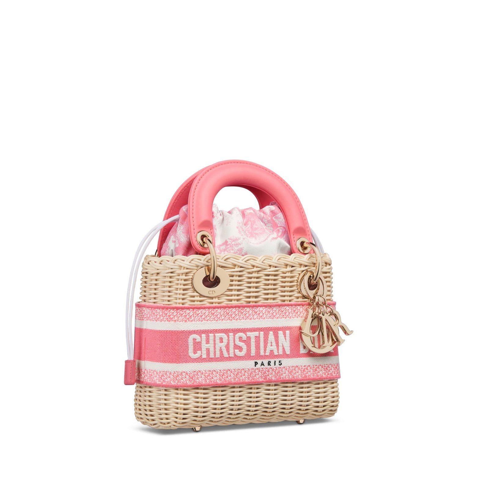 Part of the Dioriviera capsule, the Lady Dior bag epitomizes Dior’s vision of elegance and beauty. Sleek and refined, the timeless style exemplifies House savoir-faire with handwoven natural rattan. It features leather top handles and an interior drawstring pouch in candy pink Toile de Jouy jacquard. The embroidered Christian Dior Paris band, inspired by the signature Dior Book Tote, and pale gold-finish metal D.I.O.R. charms illuminate the silhouette. A wide, removable embroidered strap allows the miniature bag to be carried by hand, worn over the shoulder or crossbody.