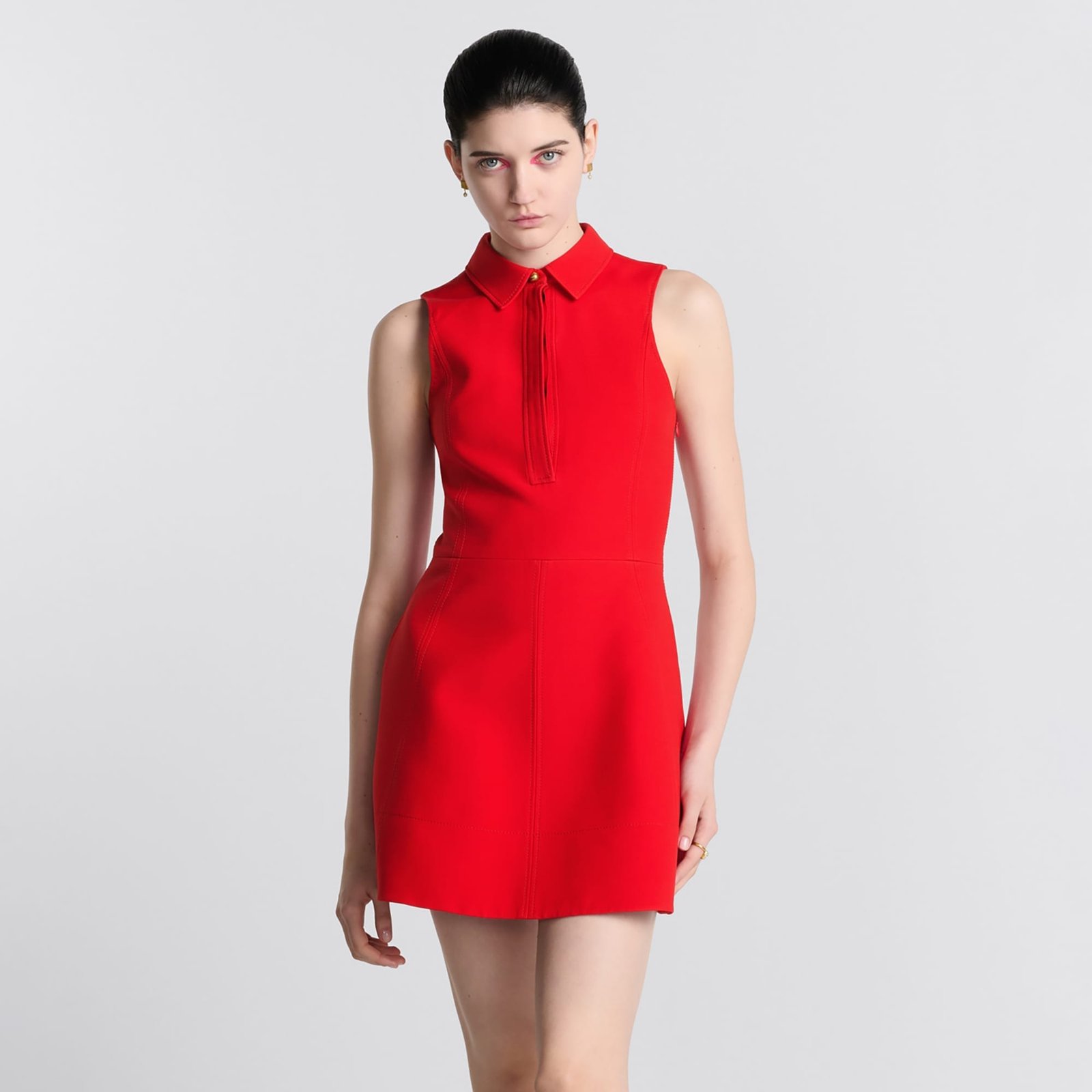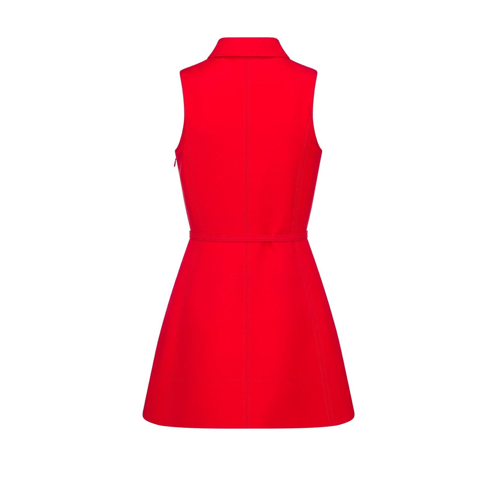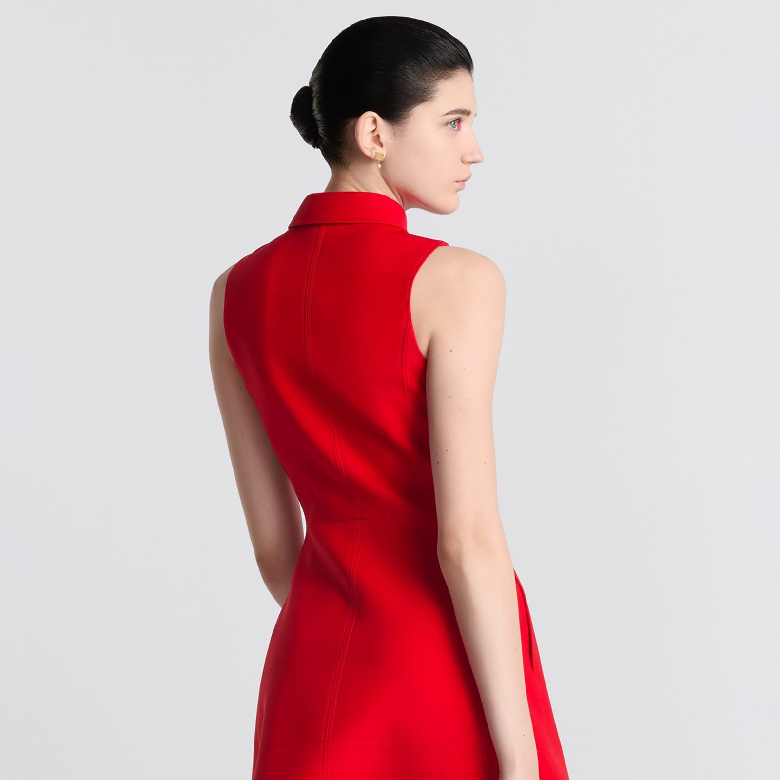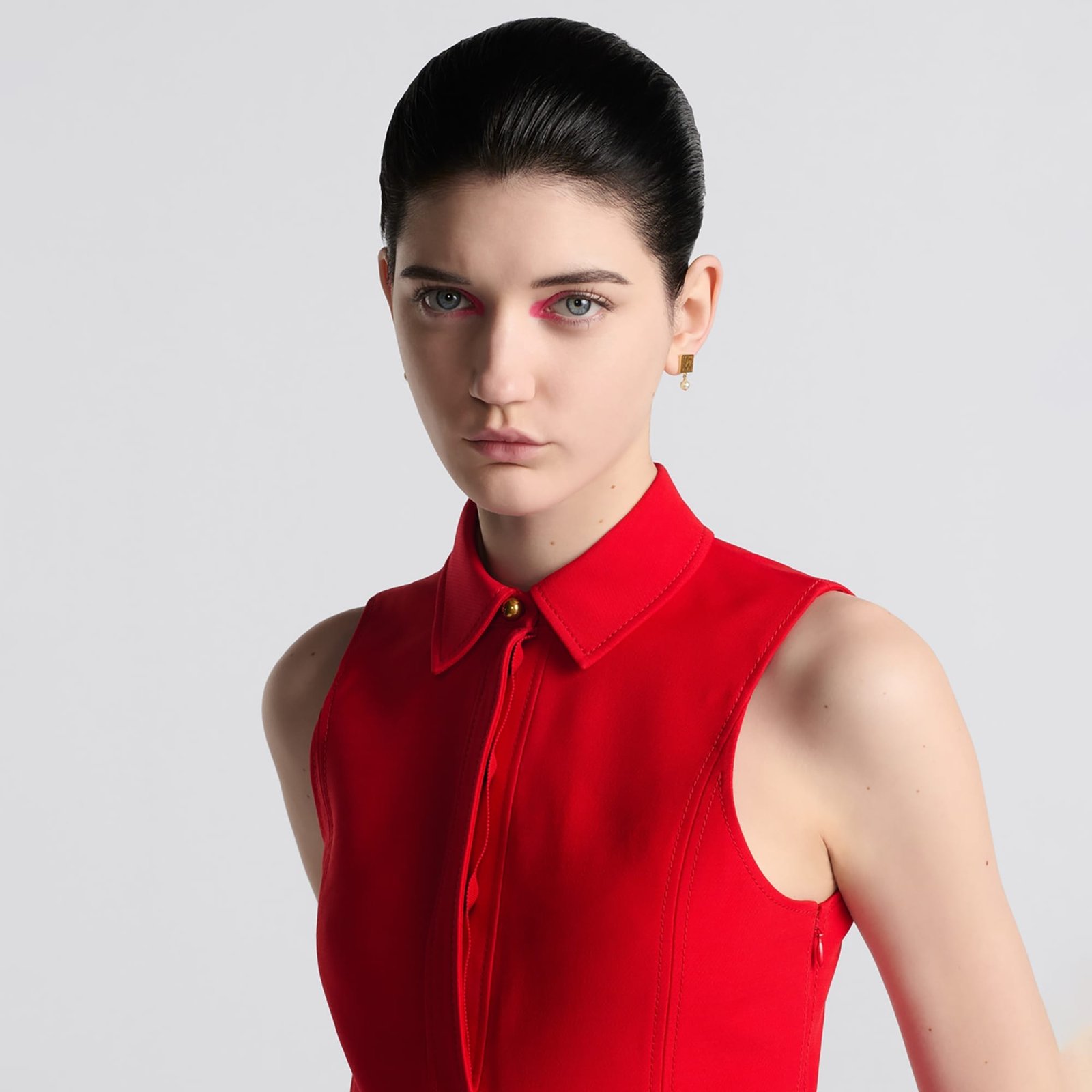 The short dress combines elegance and modernity. Crafted in red wool and silk, it is distinguished by a flared cut and a collar embellished with a Dior Tribales button, showcasing a gold-tone CD signature resin pearl inspired by the iconic House earring. Complete with side pockets and a tonal belt highlighting the waist, the sleeveless dress will create contemporary, refined looks.