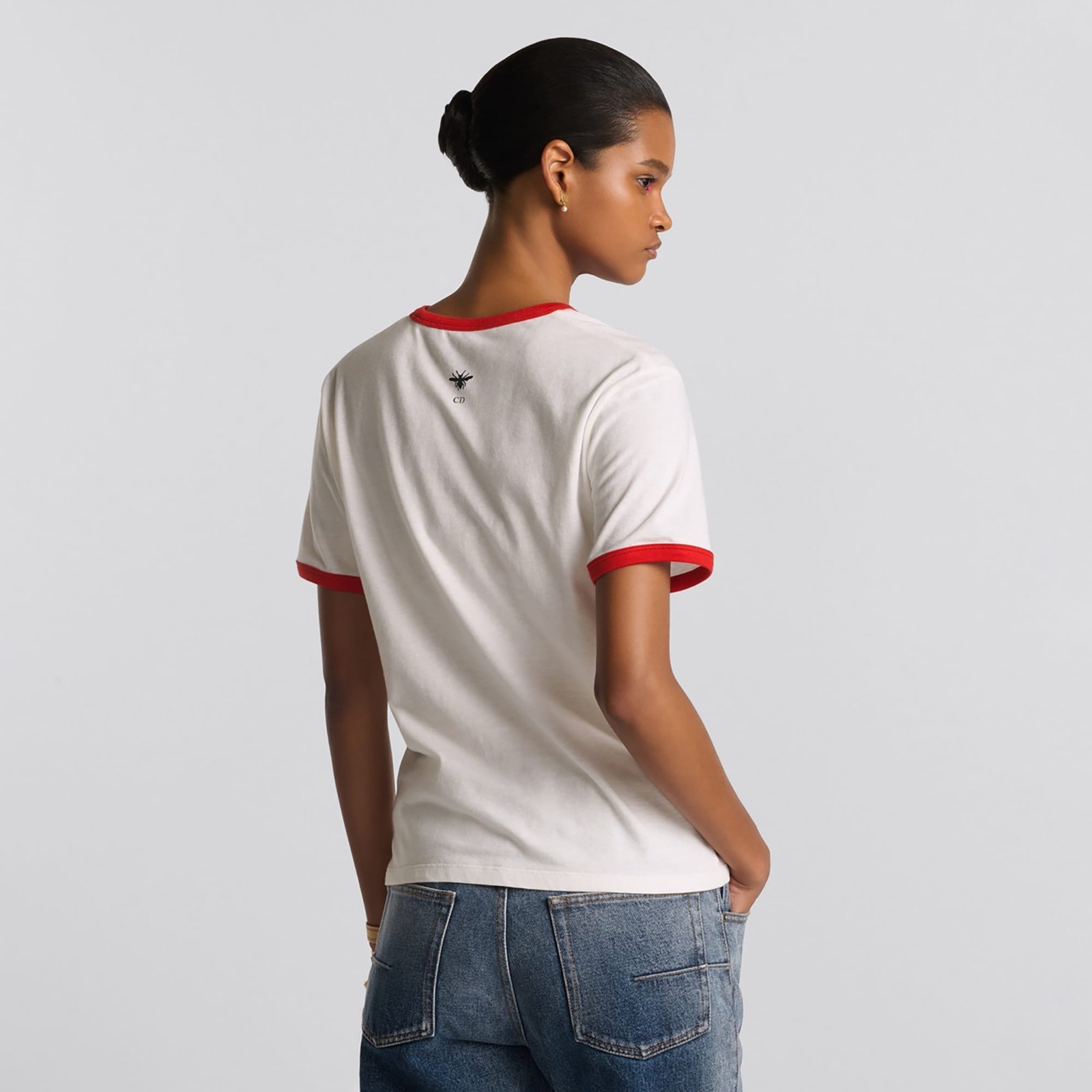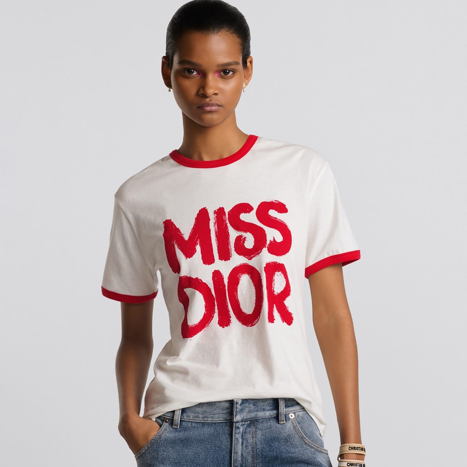 The T-shirt features the red Miss Dior Graffiti motif, a nod to the 1967 debut ready-to-wear collection and a manifesto to Maria Grazia Chiuri’s signature celebration of feminism. Crafted in white cotton and linen jersey, the classic crew-neck design is enhanced by contrasting trim. The T-shirt will complete a variety of outfits in any season and can be paired with other Miss Dior Graffiti creations.