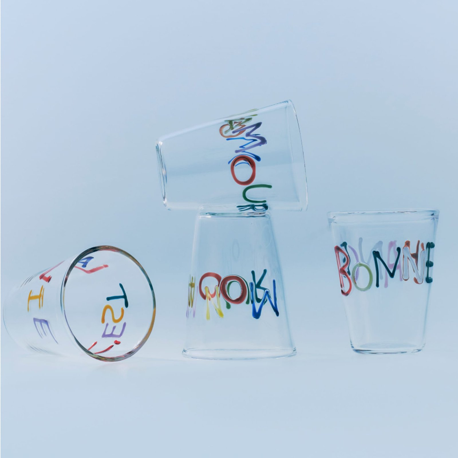 Transparent hand-blown glass with multicolor Mon Amour lettering.*