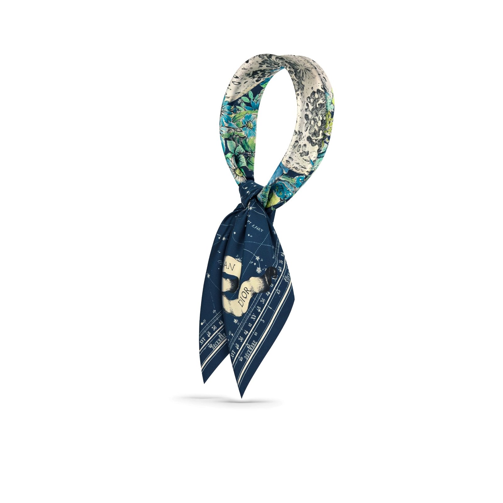 The square scarf, a signature style of the fashion show, boasts the Dior Zodiac print, a tribute to Christian Dior’s fascination with astrology. Crafted in navy blue silk twill and featuring hand-topstitched edges, the design is embellished with a ‘CHRISTIAN DIOR’ signature. The scarf can be tied at the neck or head to complete the Dior look.