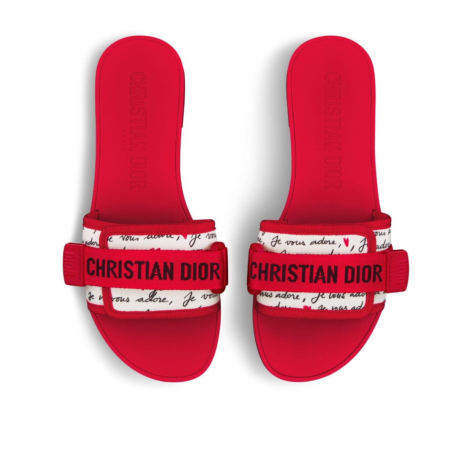 Part of the Dioramour capsule, the Dio(r)evolution slide is a summer wardrobe staple. The Christian Dior signature self-fastening strap adorns the white technical fabric upper, which showcases the black and red Je Vous Adore (I Love You) motif, inspired by the Marc Bohan for Dior archives. The supple red rubber sole adds to the casual style of the shoe, which can be paired with other Dioramour creations.