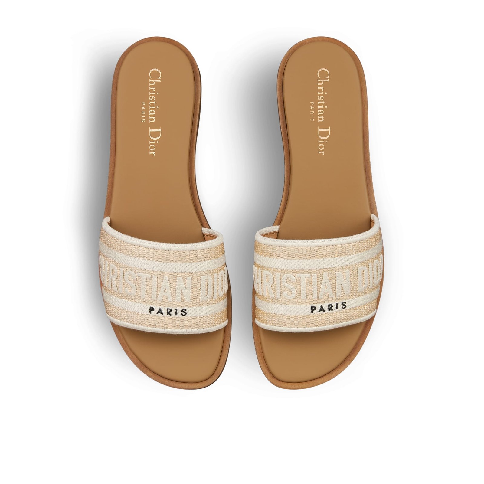 Part of the Dioriviera capsule, the Dway slide presents a timeless and iconic style. The natural raffia and white cotton upper is embroidered with the instantly recognizable Christian Dior Paris signature, while the padded leather insole offers ultimate comfort. The minimalist silhouette will slip on effortlessly to complete a laid-back outfit. The shoe can be paired with other creations from the Dioriviera capsule.