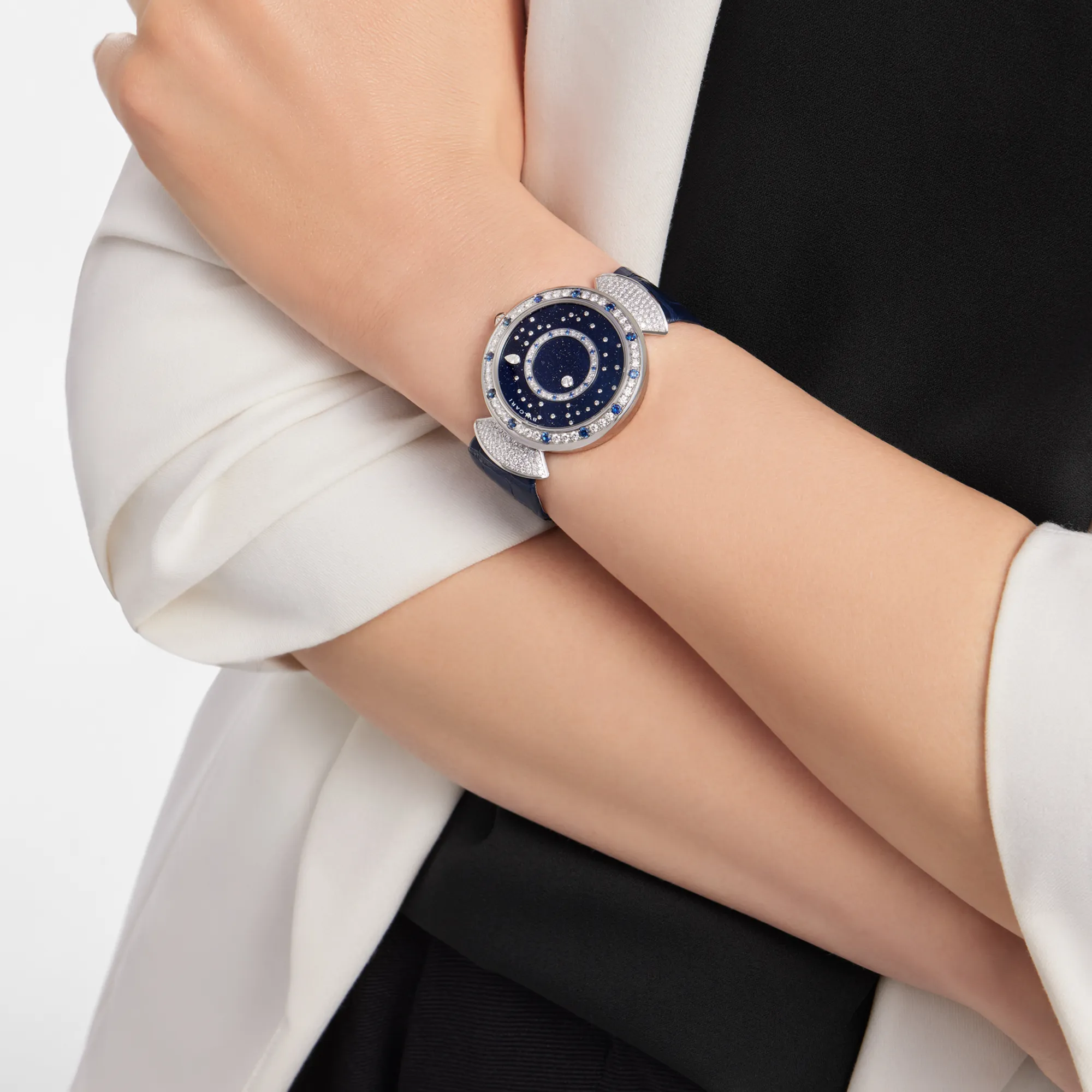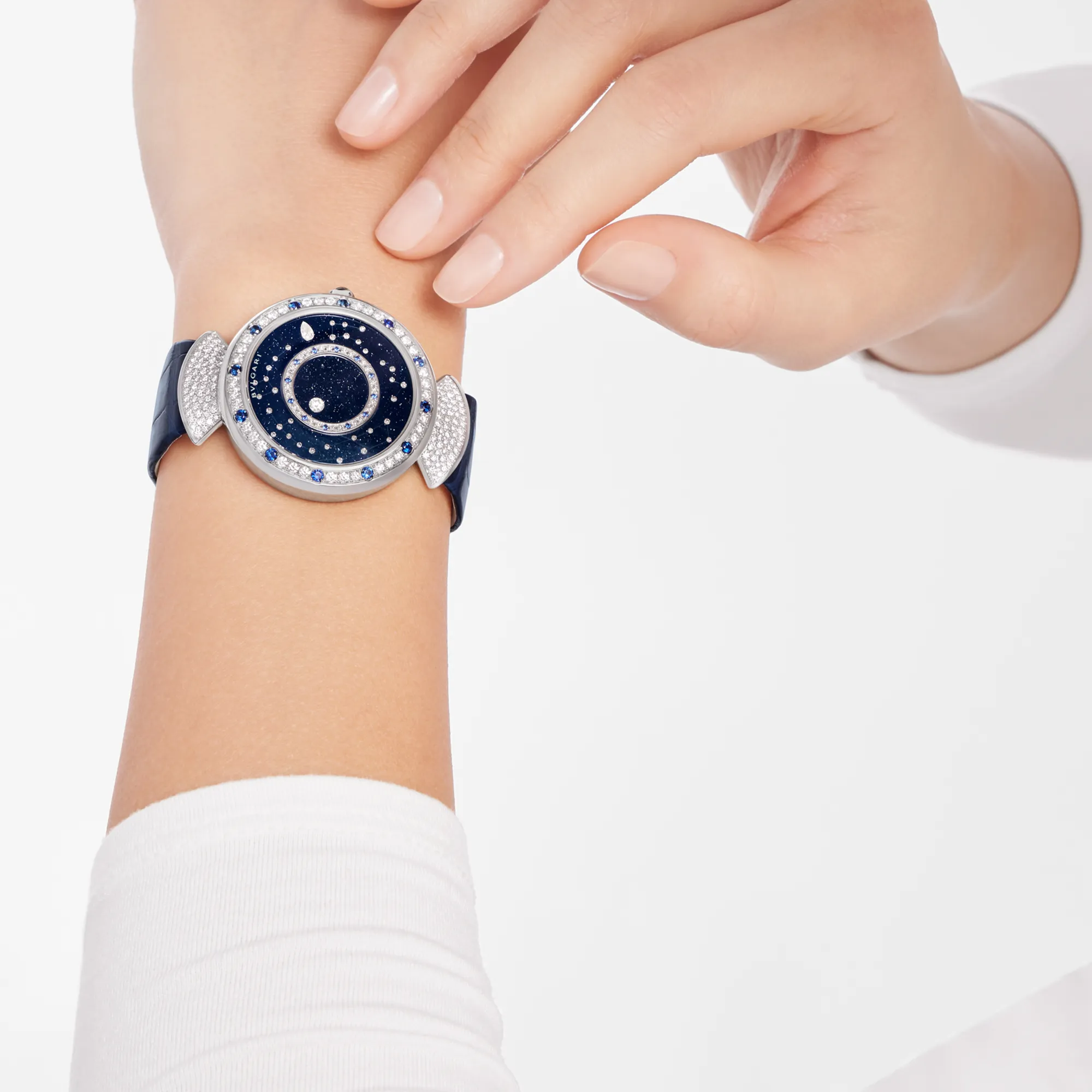 Inspired by the magic of a Roman night, the Divas’Dream watch captures the poetry of the city’s star studded sky. With its blue aventurine dial building the backdrop to a diamond constellation, the watch’s design mirrors faithfully the sky map of the Eternal City. Through an exquisite mechanism based on the rotation of two discs, two floating diamonds mark the hours and the minutes as the brightest stars of the firmament. The case is embraced by the iconic fan-shaped motif of the collection, drawing its feminine design from the mosaic of Rome’s ancient Caracalla Baths. Divas’Dream watch with mechanical manufacture movement, automatic winding, BVL 308 caliber, 37 mm 18 kt white gold case set with round brilliant-cut diamonds and sapphires, smoked sapphire glass backcase, 18 kt white gold crown set with a sapphire, aventurine rotating discs with diamonds and printed constellations, dark blue alligator strap and 18 kt white gold pin buckle.