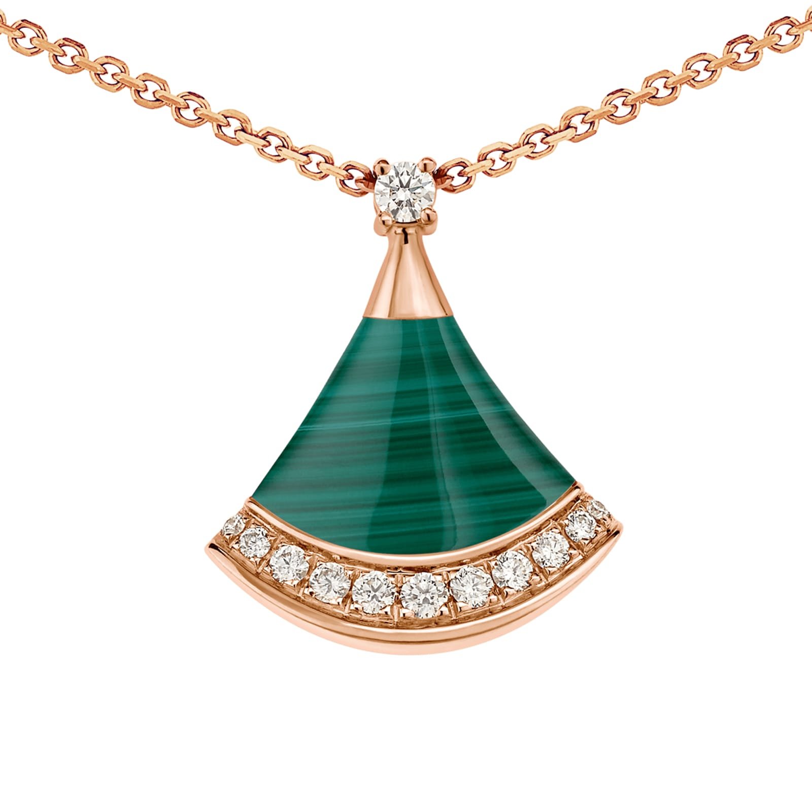 A refined expression of joyful femininity, the Divas’Dream 18 kt rose gold necklace offers a colourful interpretation of the iconic fan-shaped motif. Deeply rooted in Bvlgari’s Roman heritage, the aesthetic signature of the collection is rendered through a delicate pendant artfully set with a green malachite element and lit by pave diamonds. Graceful and timeless, the creation is an ode to spontaneous beauty.