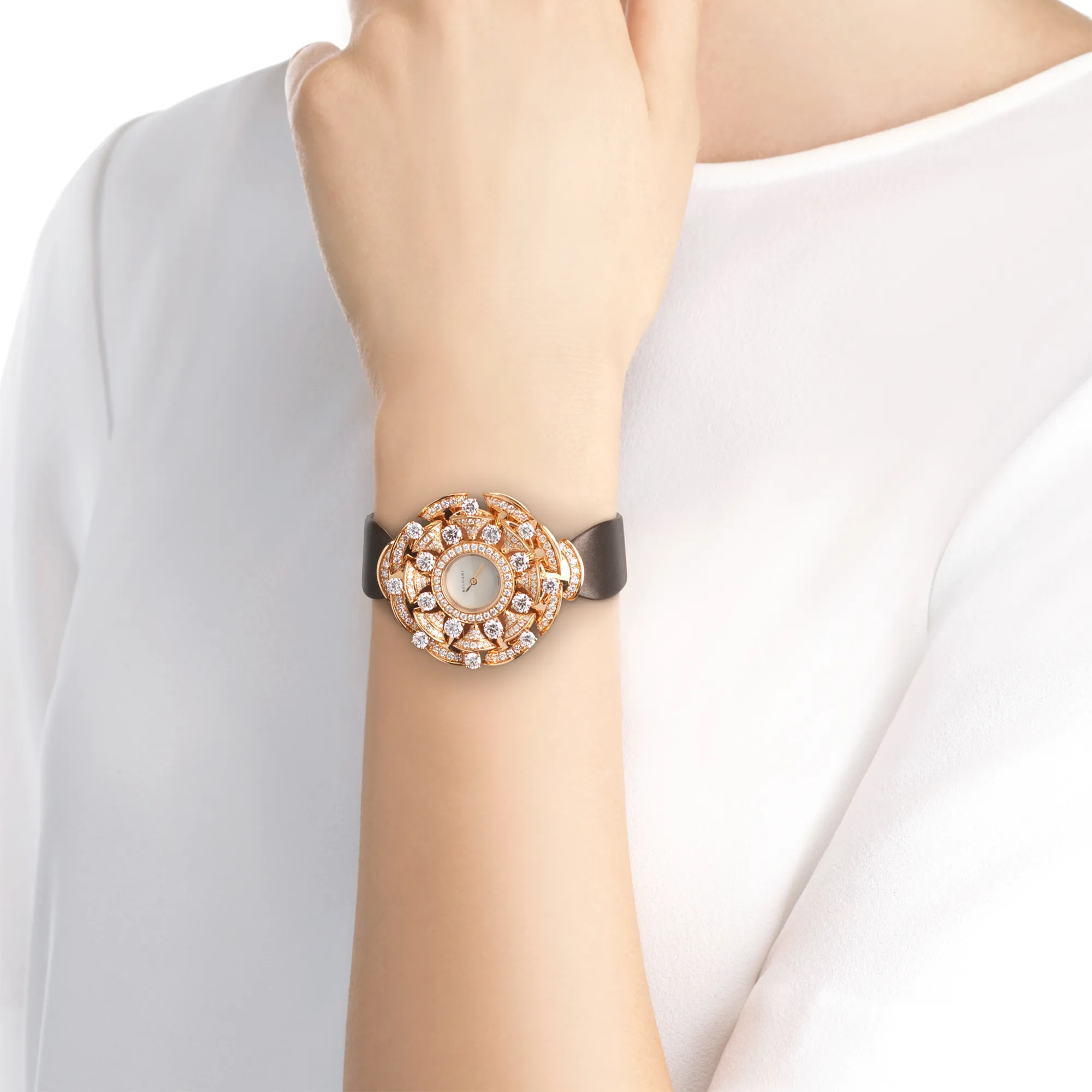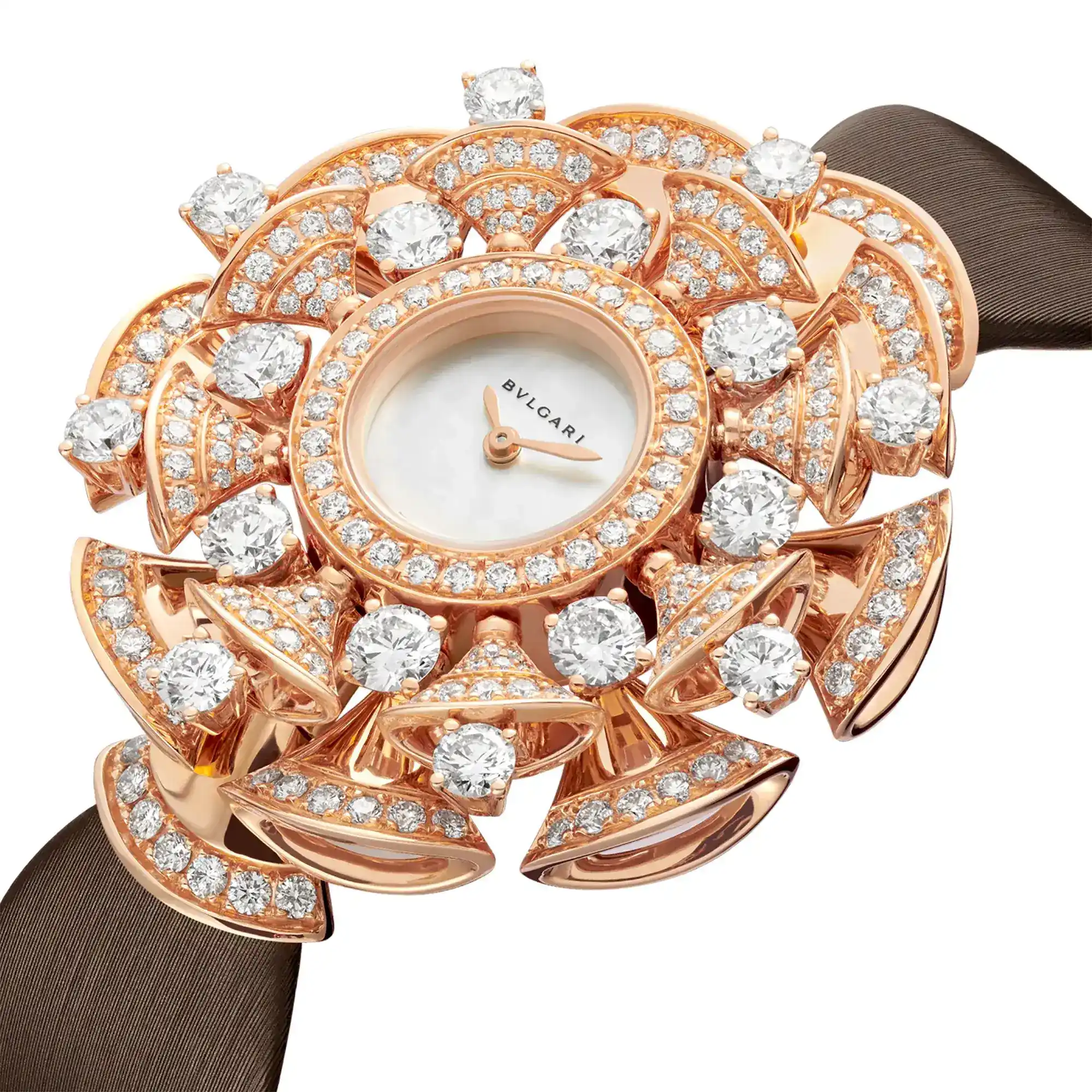 Framing the radiance of a gleaming dial with the delicacy of the iconic fan-shaped motif, the Divas’Dream timepiece reveals the multifaceted shades of contemporary women. Inspired by feminine elegance and by the enchanting allure of the eternal city, the Divas’Dream timepiece pays homage to the most glamorous divas with an unmistakable Roman spirit. Quintessentially feminine and refined, the jewelry watch is sculpted capturing the charm of the Caracalla Baths marble and the sensual curves of its fan-shaped mosaics, reflecting the very essence of Italian beauty. DVAS’DREAM watch with quartz movement, 39mm 18 kt rose gold case set with brilliant-cut diamonds, white mother-of-pearl dial, brown satin strap and 18 kt rose gold folding clasp set with brilliant-cut diamonds.