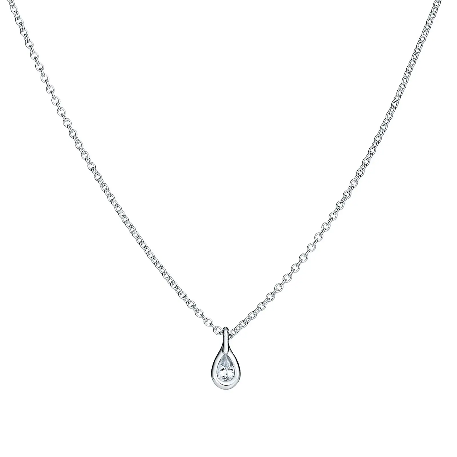 Tiffany diamonds catch the light and make it dance. Pendant in sterling silver with a pear-shaped diamond. On a 16″ chain. Carat weight .07. Original designs copyrighted by the Nando and Elsa Peretti Foundation.