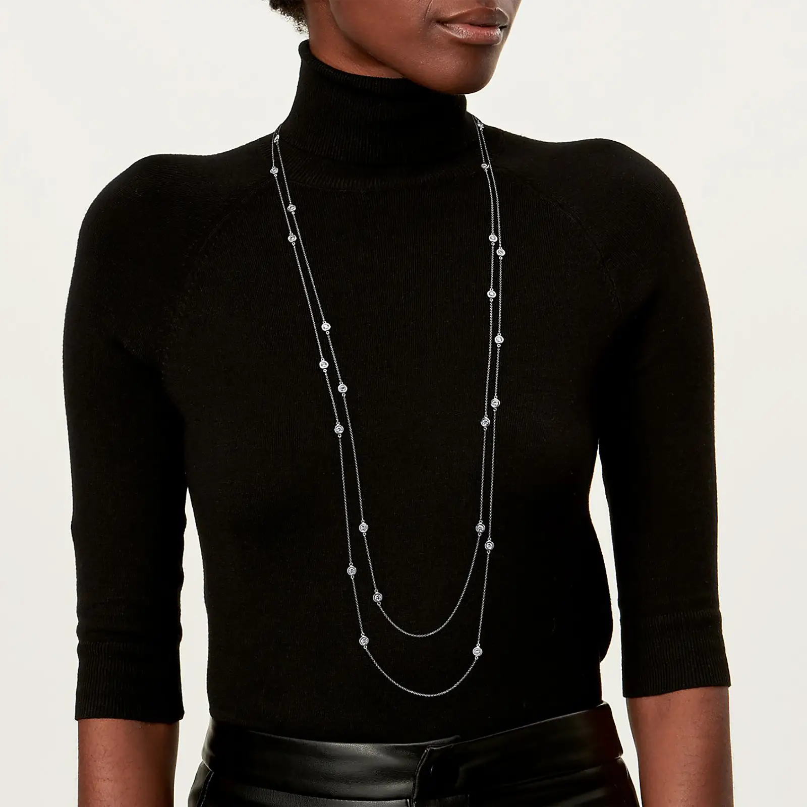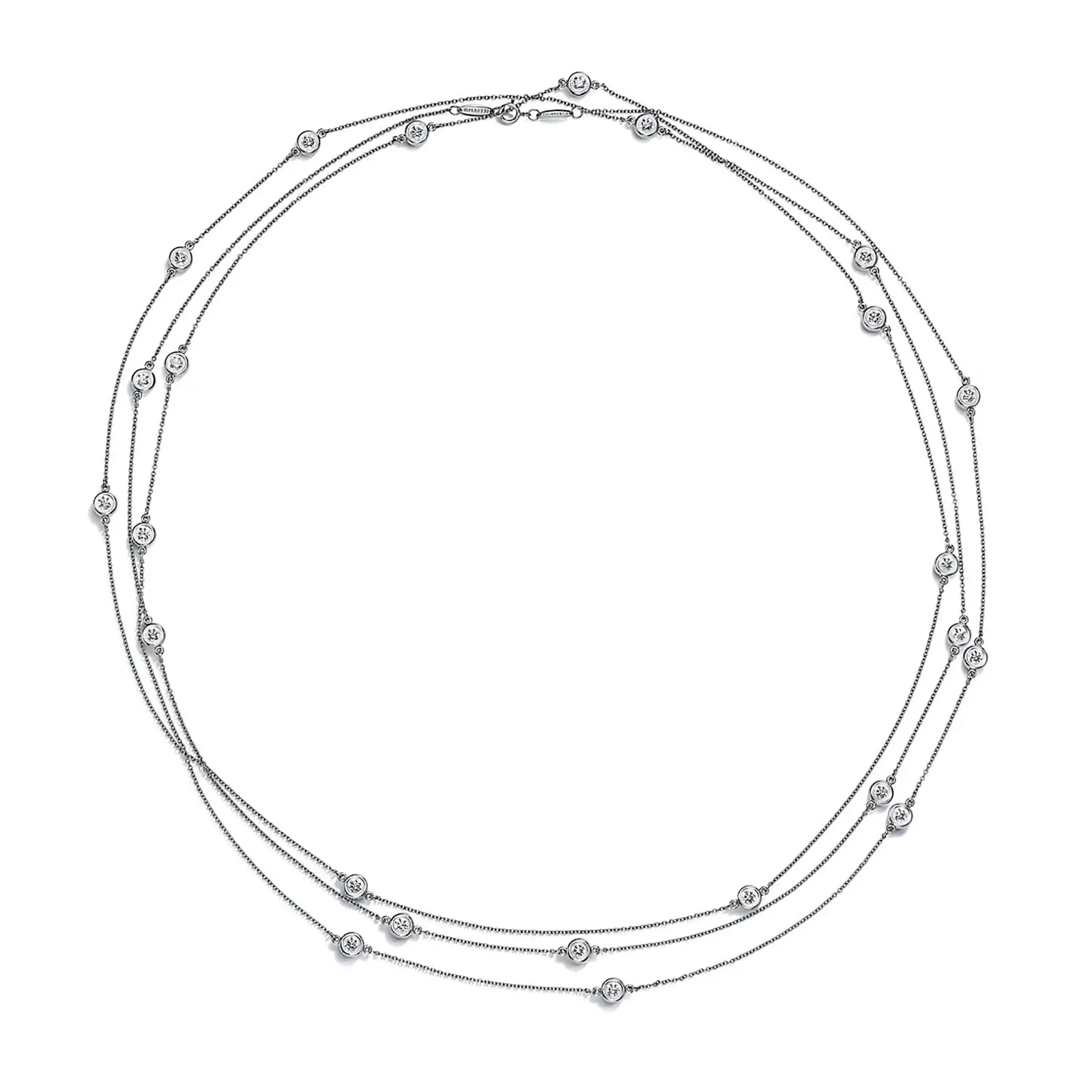 Elsa Peretti’s revolutionary Diamonds by the Yard collection features a combination of fine, fluid chains and bezel-set stones that forever changed the role of diamonds in fashion. Each round brilliant diamond is positioned gracefully along a platinum chain to look like a droplet of light against the skin. Layer this design with other Diamonds by the Yard pendants and necklaces of varying lengths and metals for a look that’s all your own.