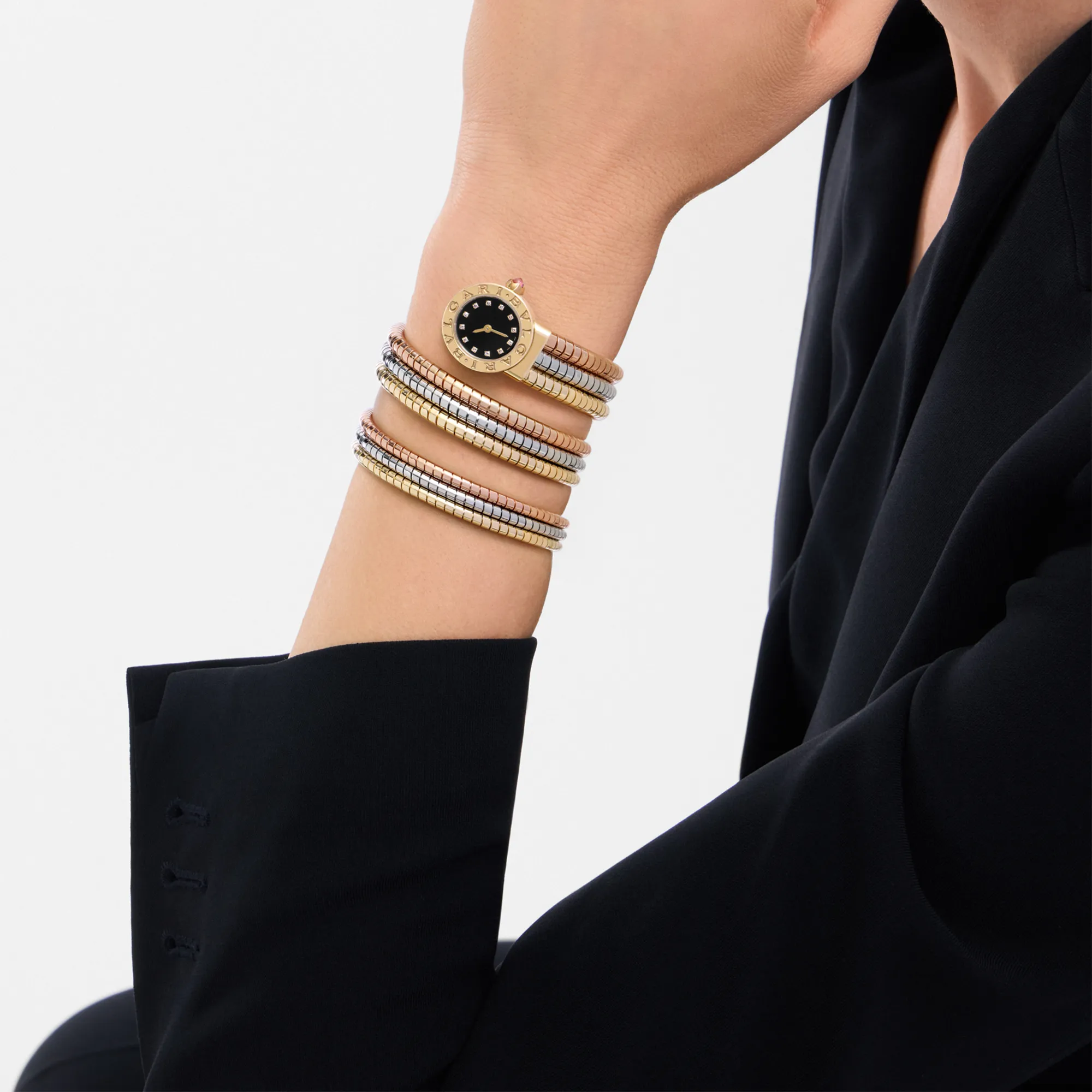 Merging two emblems of Bvlgari’s pioneering spirit and innovative design, the Bvlgari Bvlgari Tubogas watch unites the tubular lightness of the famed Tubogas jewellery technique with the iconic aesthetic signature of the Maison. Inspired by the curved inscriptions on ancient Roman coins, the double logo engraved on the 18 kt yellow gold bezel frames a black lacquered dial: this is the expression of Bvlgari’s unparalleled ability to fuse culture and modernity into creations that transcend time and trends. The flexible three-gold double-spiral bracelet draws inspiration from the Maison’s historical archives. The brilliant-cut diamond indexes add a precious touch.Bvlgari Bvlgari Tubogas watch with quartz movement, hours and minutes functions, 21 mm 18 kt yellow gold case, 18 kt yellow gold bezel engraved with double logo, black lacquered dial, 12 round brilliant-cut diamond indexes, 18 kt yellow gold crown set with a cabochon-cut pink rubellite, double-spiral mini Tubogas bracelet in 18 kt yellow, white and rose gold. Water-resistant up to 50 metres.
