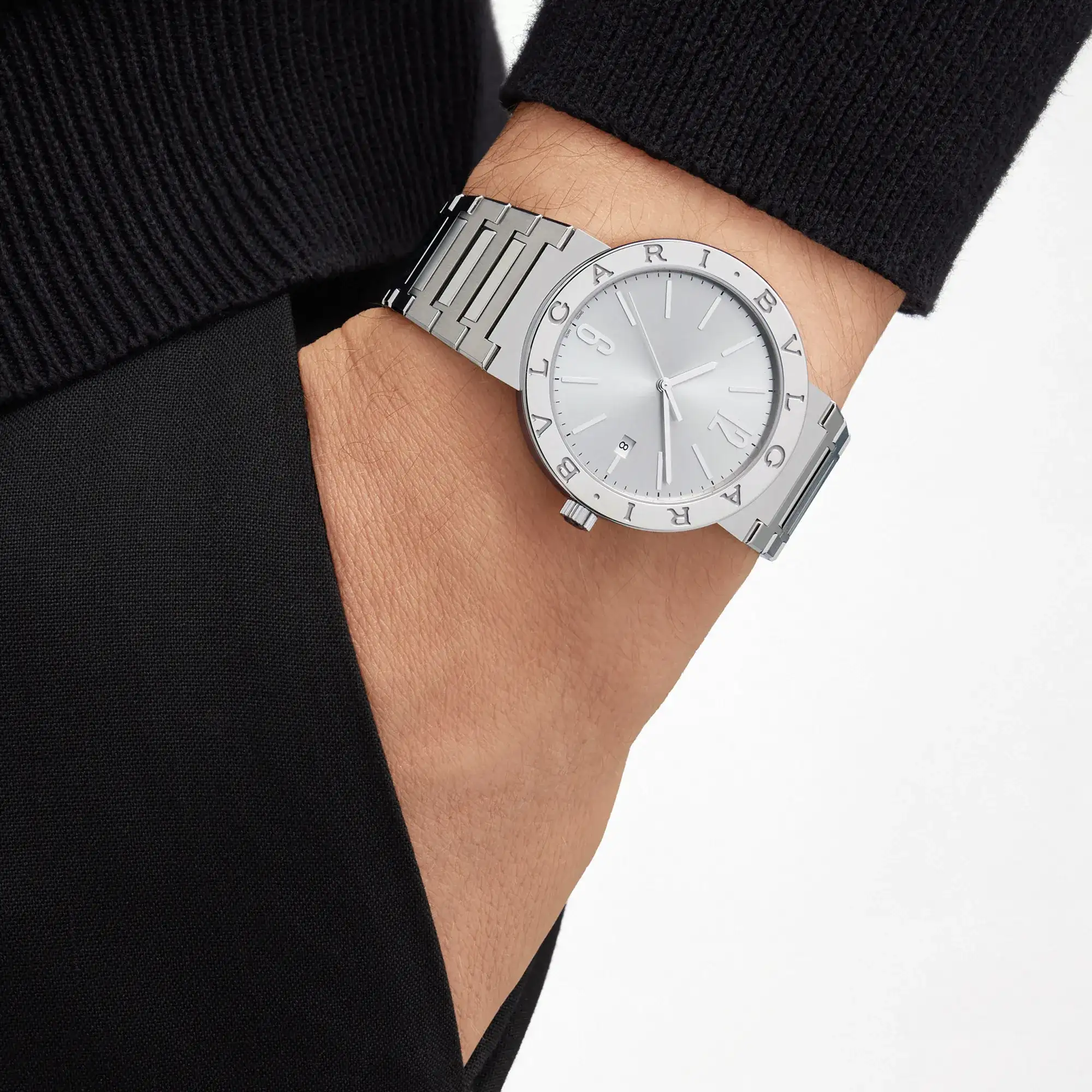 A unique collision of Swiss savoir faire and the daring spirit of Italian design, the Bvlgari Bvlgari watch in stainless steel blends timeless class with exquisite watchmaking skills. Inspired by the curved inscriptions on ancient Roman coins, the iconic double logo engraved on the bezel and framing the silvered sunray dial expresses Bvlgari’s unparalleled ability to fuse culture and modernity into creations that go beyond time and trends.Bvlgari Bvlgari watch with mechanical manufacture movement, automatic winding and date, BVL 191 – Solotempo calibre decorated with cotes de Geneve, chamfering and snailing, 42-hour power reserve, frequency 28,800 vph(4 Hz). 41 mm stainless steel case, stainless steel bezel engraved with double logo, stainless steel crown set with black ceramic insert, silvered sunray dial, stainless steel bracelet and folding buckle. Water-resistant up to 50 metres.