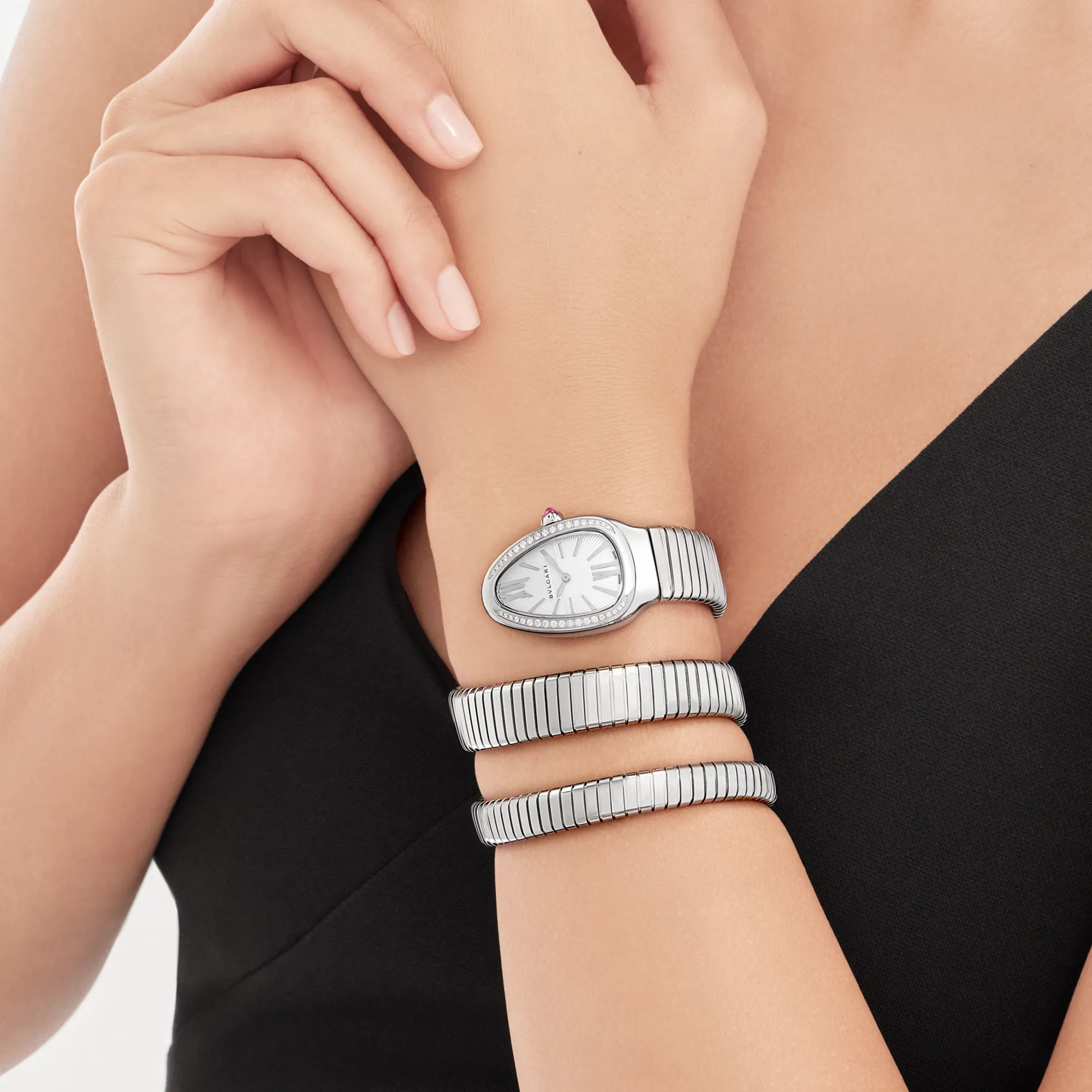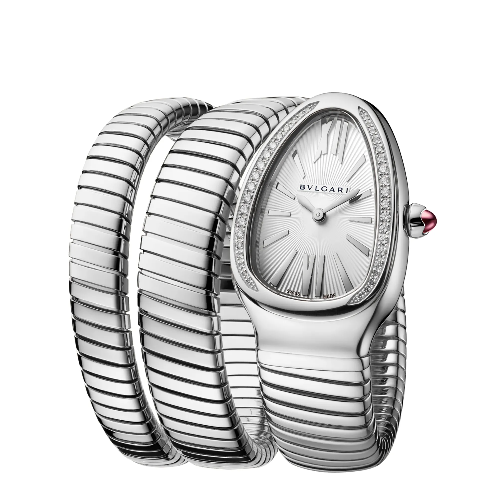 Merging two of the most iconic symbols of Bvlgari design, the Serpenti Tubogas watch coils the sinuosity of the snake with the contemporary soul of tubogas. Evoking both the sensual curves of a woman and the fluid shape of the serpent, the timepiece is crafted with the shapely lines of this specific technique, with a flexible and tubular litheness. Radiating glamour and a truly individual style, this watch marks a distinctive chapter in the constant evolution of Serpenti. Serpenti Tubogas watch with quartz movement, 35 mm stainless steel curved case set with brilliant cut diamonds, stainless steel crown set with a cabochon cut pink rubellite, silver opaline dial with guilloche soleil treatment and hand-applied indexes, double spiral stainless steel bracelet.
