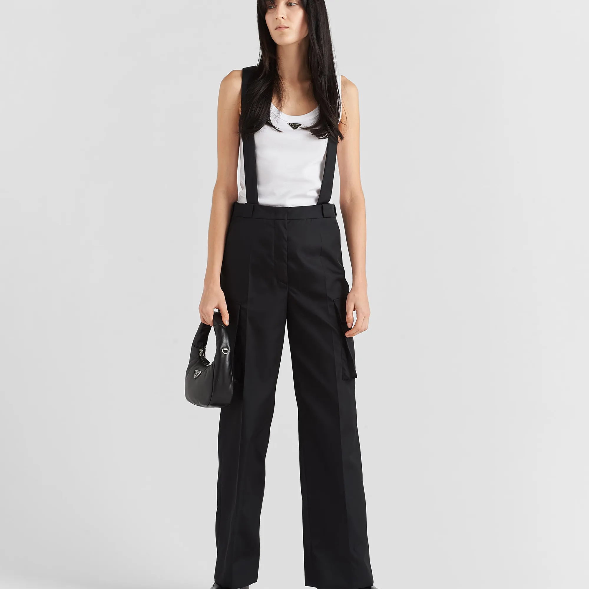 A harmonious, bold silhouette characterizes this mini-bag made of padded nappa leather accented with the detachable, adjustable shoulder strap. Defined by its versatile allure, the accessory has a zipper closure and is decorated with the emblematic enameled metal triangle logo.