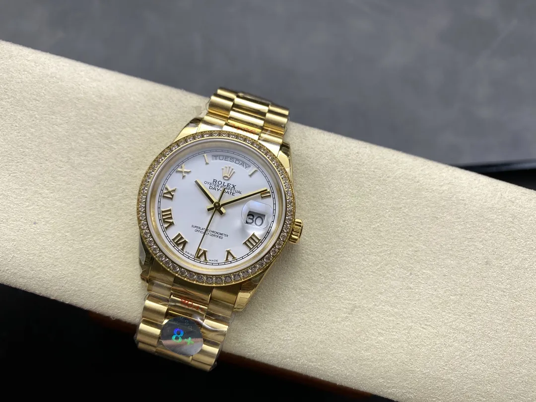 8+ Factory exclusively customizes the matched version of the Rolex day-date 36mm belt weighted version, specially equipped with 2834 fully automatic mechanical movement 106g and the new customized 3255 fully automatic mechanical movement 90g. The photo is the 2834 version.