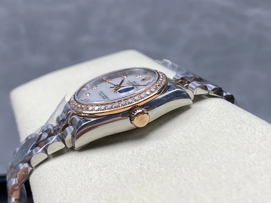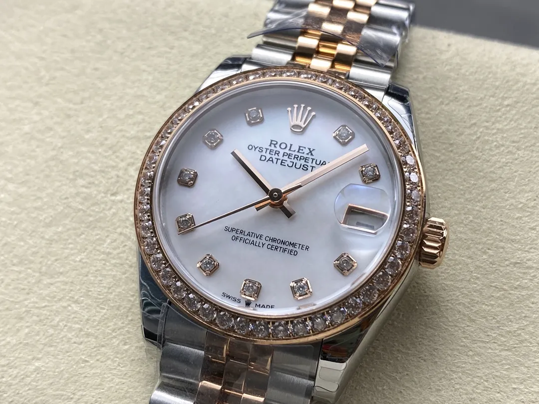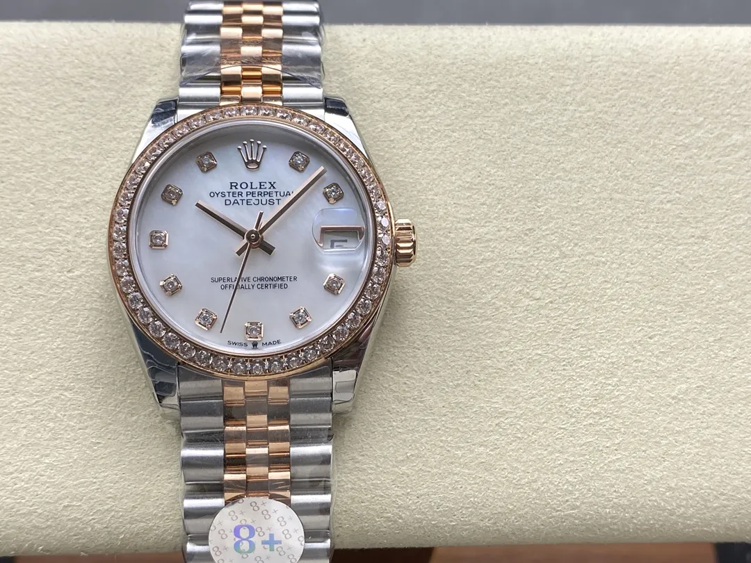Fake Rolex Replica Watches Lady-Datejust 31 Rose Gold/Steel White Mother of Pearl Diamond Dial & Diamond Bezel Jubilee Bracelet 278381RBR