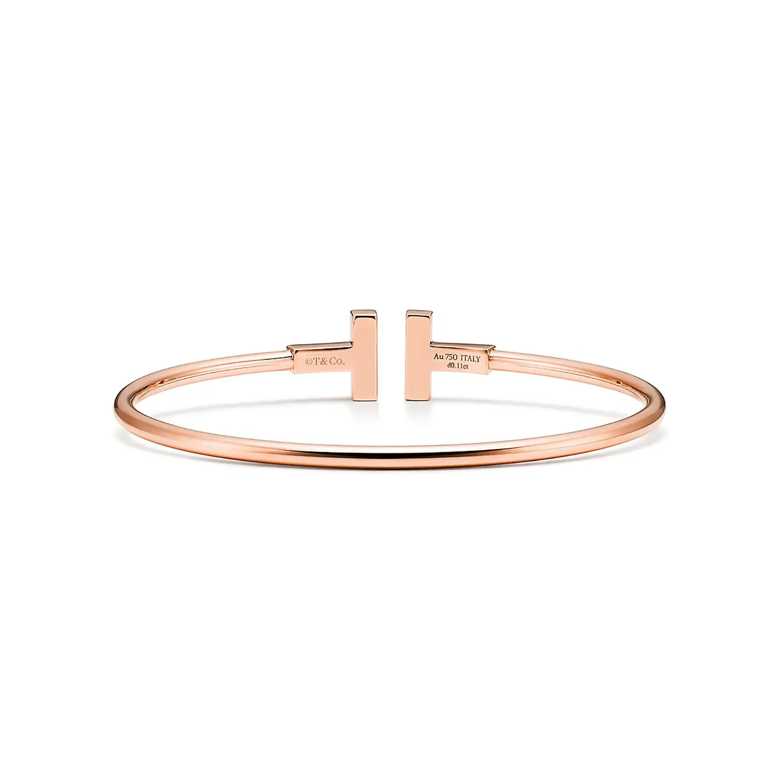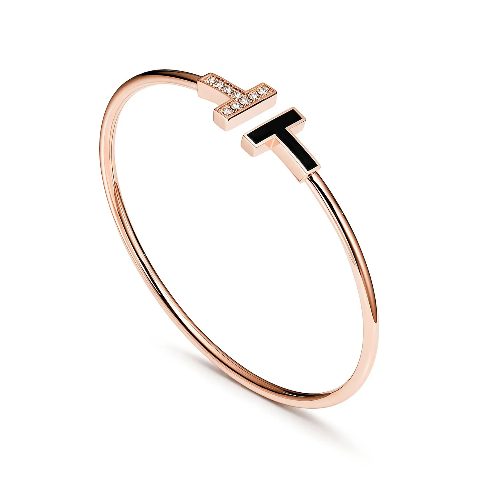 Tiffany T is an expression of love’s endless potential. Inspired by an archival bracelet from 1975, T is an homage to the House’s iconic motif and the spirit of New York, which founder Charles Lewis Tiffany regarded as the place of promise and possibilities. This rose gold wire bracelet is enhanced with diamonds and black onyx, a unique variety of quartz found in nature, which together create a bold contrast. The natural formation of the stone creates subtle differences in appearance, ensuring each piece is as unique as its wearer. Style this sleek design in a mixed metal bracelet stack.